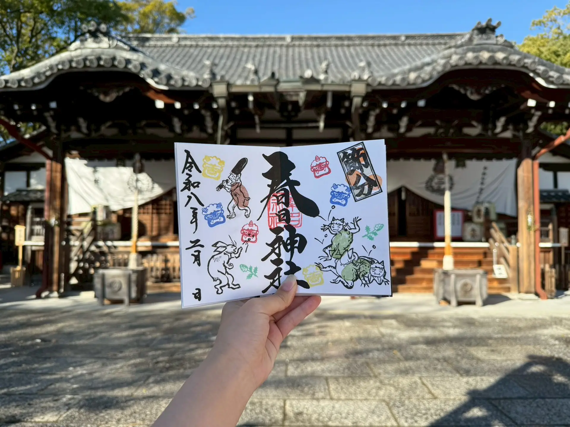 鳥獣戯画の仲間たちが春日神社で「おにはーそと、ふくわーうち」と豆まきをしている様子が愛らしいデザインです。
