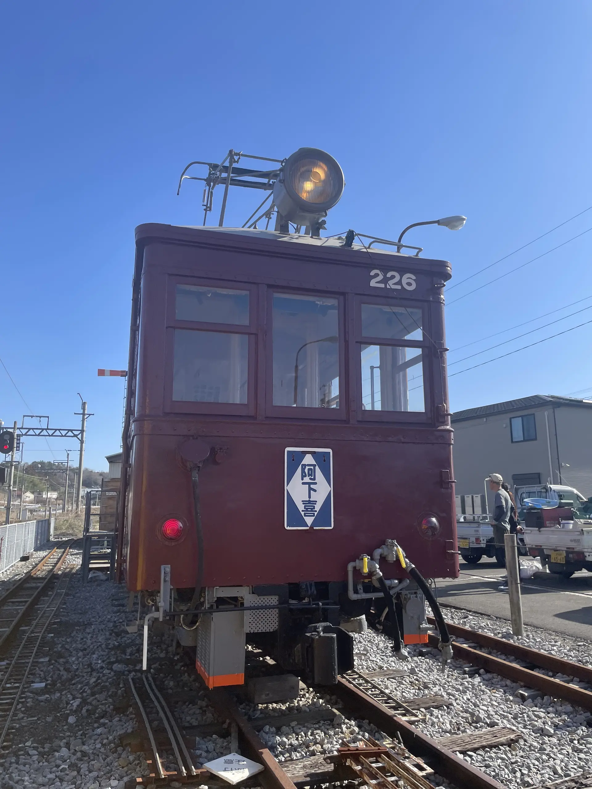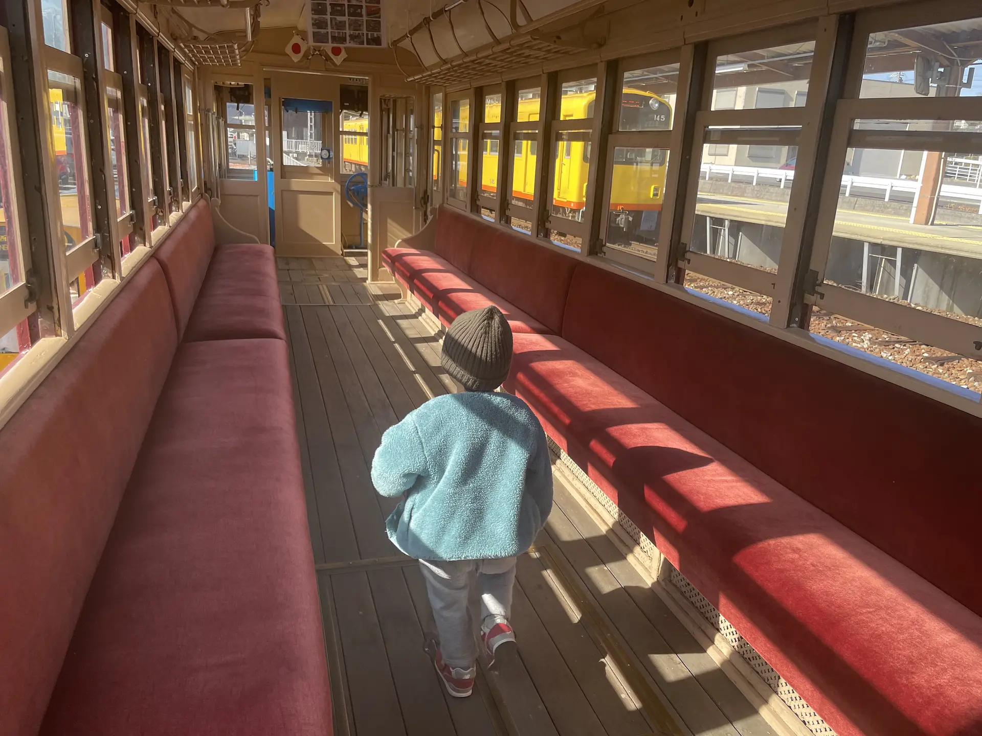 車両の中にも入ることができ、木製の床や車両の大きさも感じられてとても貴重な機会でした。ちょうどこの日も、ドライバーを手に持ったボランティアさんが車両の点検をしていました。大切に守られているのですね。