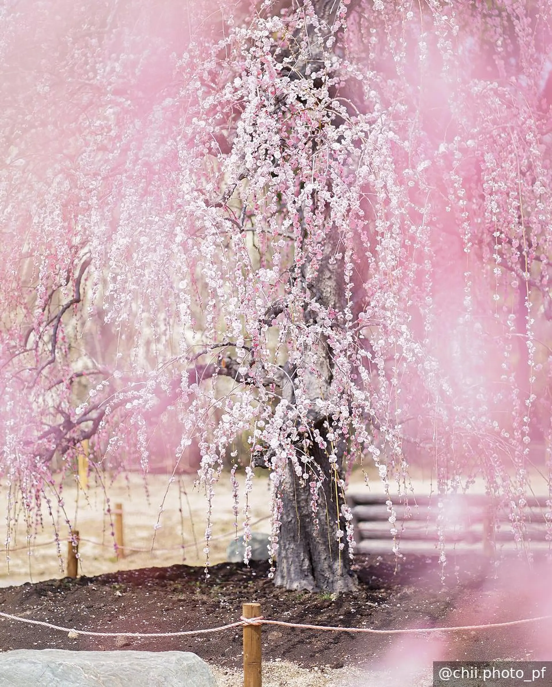 ガーデン内は起伏が少なく歩きやすいので、お子様としだれ梅の撮影もおすすめです♪我が家は入学前のランドセルフォトも 枝や花に当たらないように気をつけて撮りました◎ 周りのロープがピンク色なので、しだれ梅を柔らかく包み込むように見えて、写り込んでも綺麗に見えます。