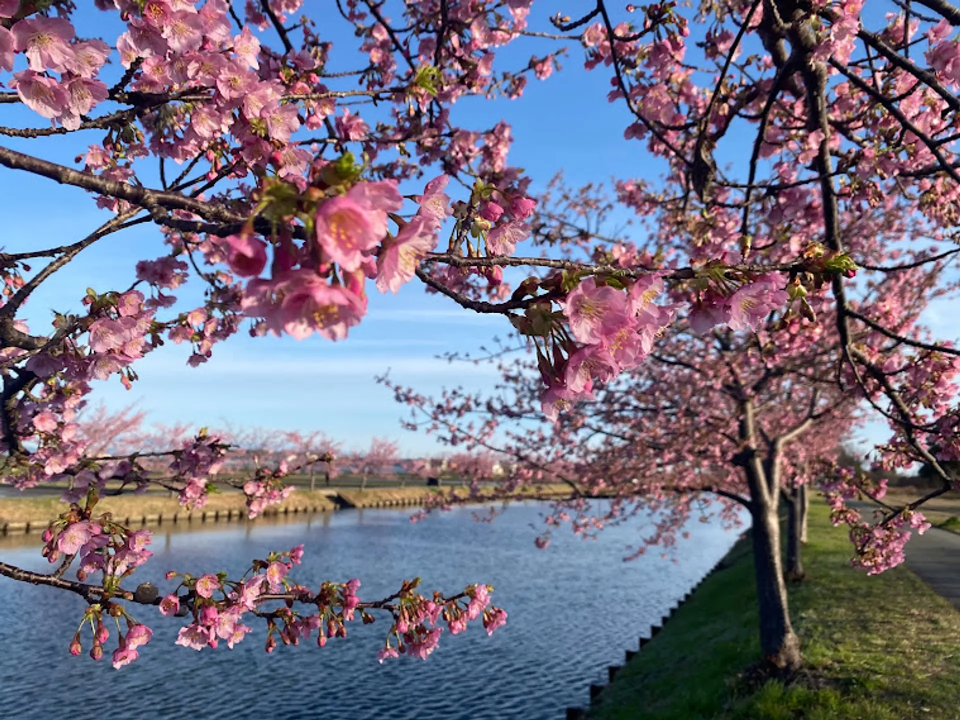 春の絶景、笠松河津桜ロードの河津桜の花の撮影ポイントなどを詳しく紹介した記事をご覧いただけます。