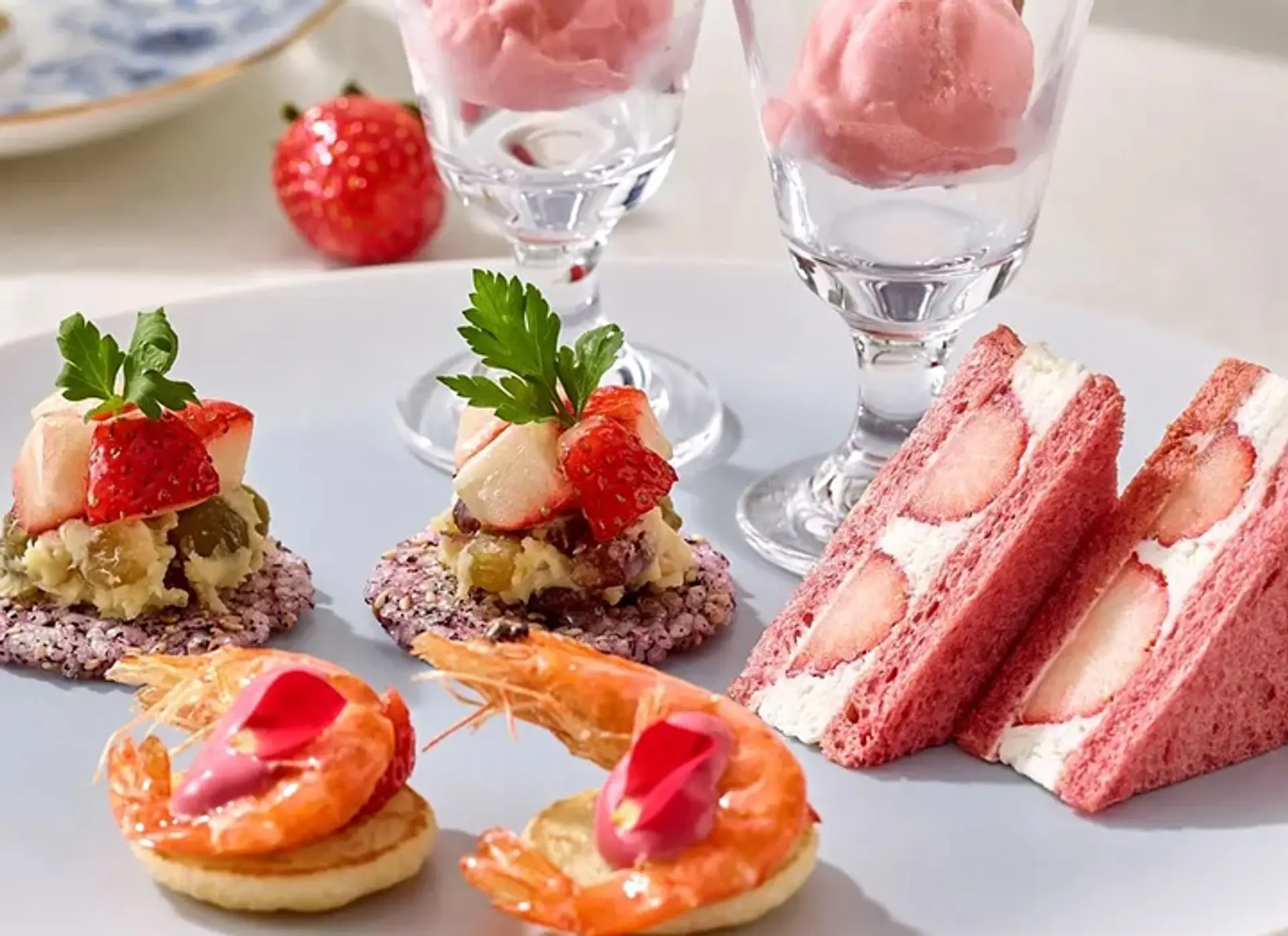 アフタヌーンティーで味わえるのは、「リナロール」という甘い香り成分を多く含む三重県産いちご『かおり野』、甘味・酸味・風味・うま味が“よつぼし級”に揃ったことから名付けられた『よつぼし』、志摩市特産の『レッドパール』など、地元の自然に育まれた旬のいちごたち。これらをシェフ・パティシエたちが和洋それぞれの技法を活かし、自由な発想でスイーツやセイボリーに仕上げました。
