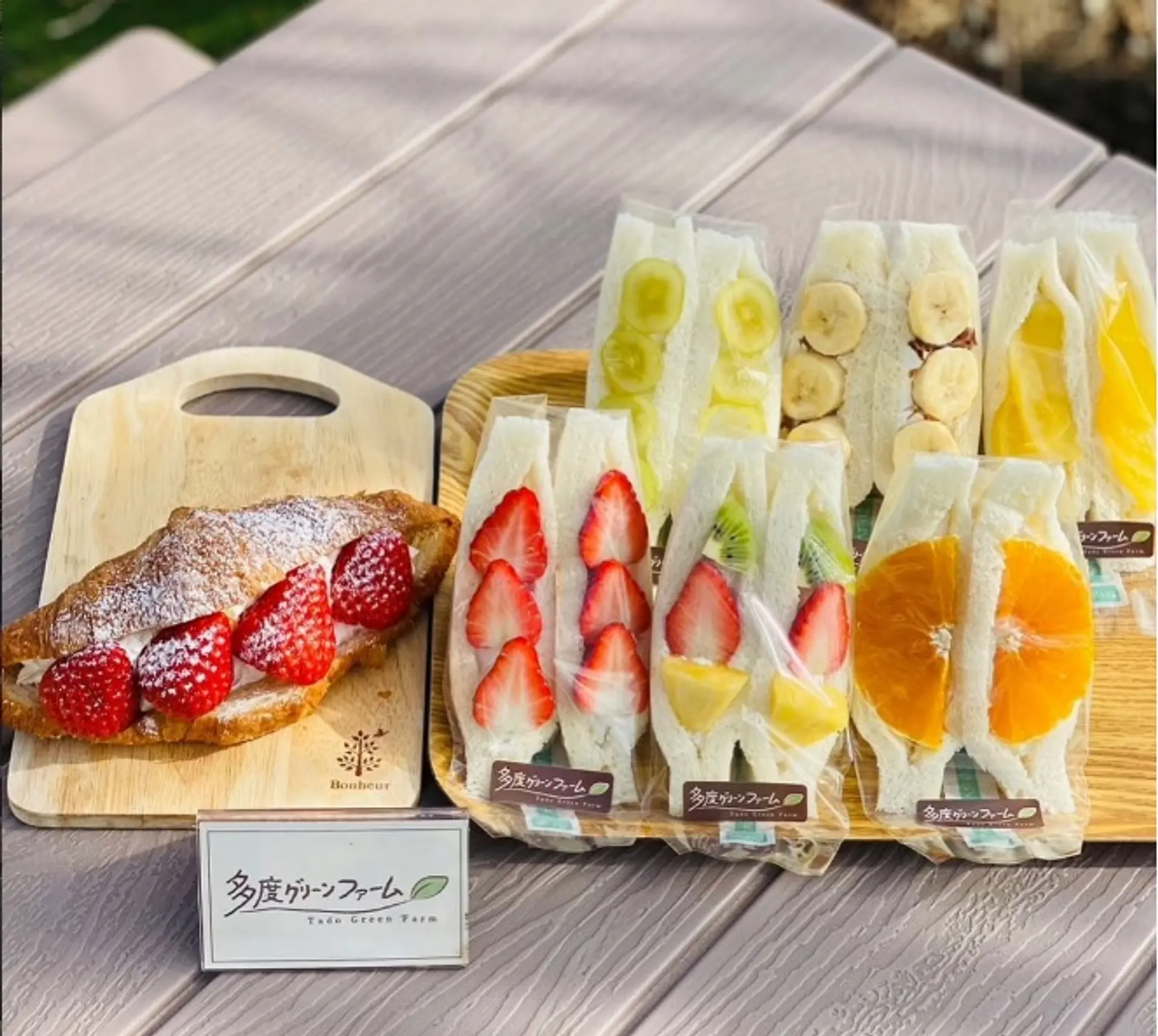 多度グリーンファームでは、季節のフルーツサンドが人気!イチゴの季節には「いちごサンド」が1番人気です。多度グリーンファームでは自社の農園で栽培したイチゴしか使用しないので、いちご収穫が始まったら「いちごサンド」もスタートしますよ!