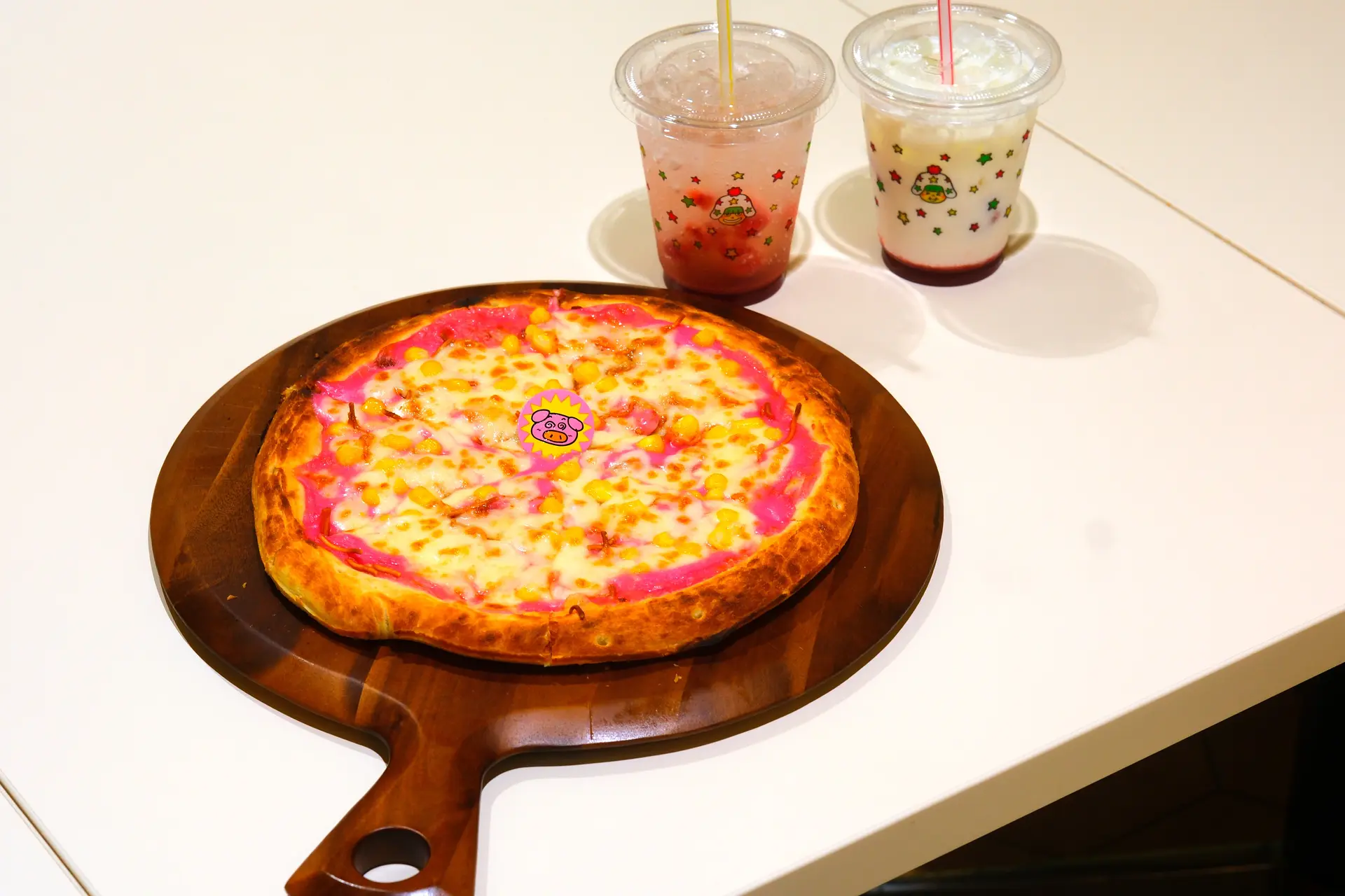 ブタメンくんモチーフのピンク色のピザが登場!「ももいろブタメングラタンピザ」は中央にブタメンくんがちょこんとのっていて、春らしい桃色カラーがとってもキュート。 桃色は、人工着色料を使わず、「ビーツパウダー」で表現しています♪