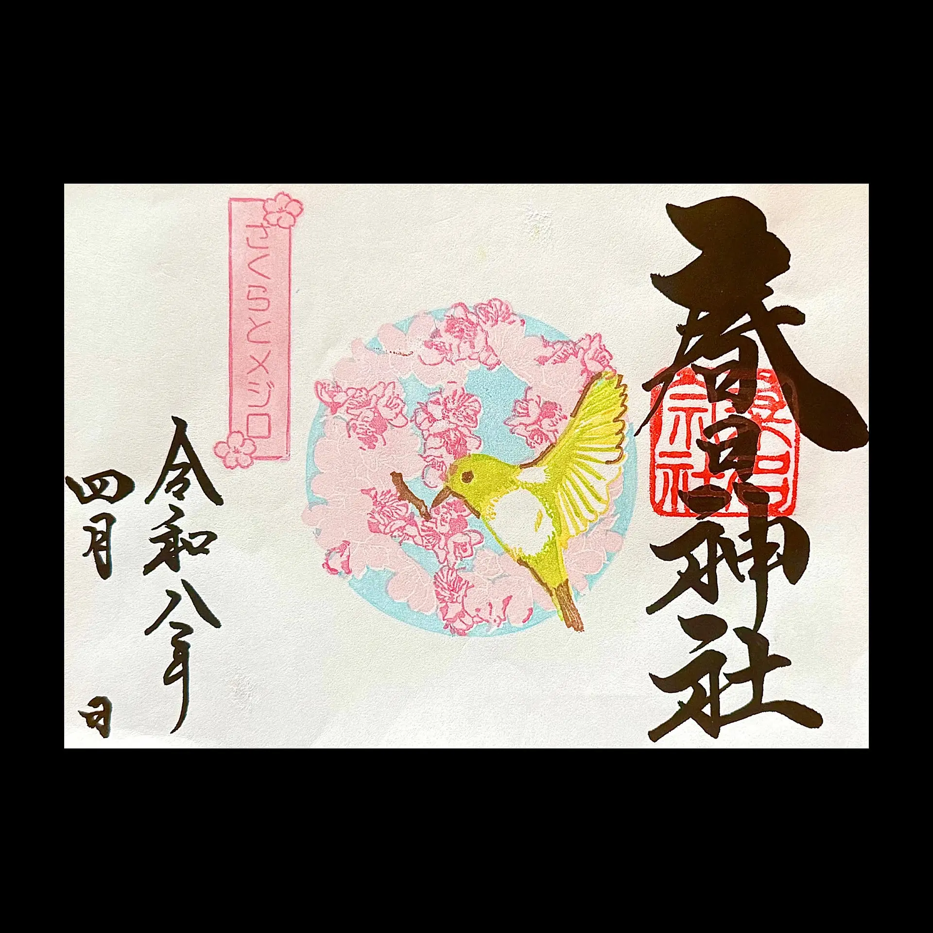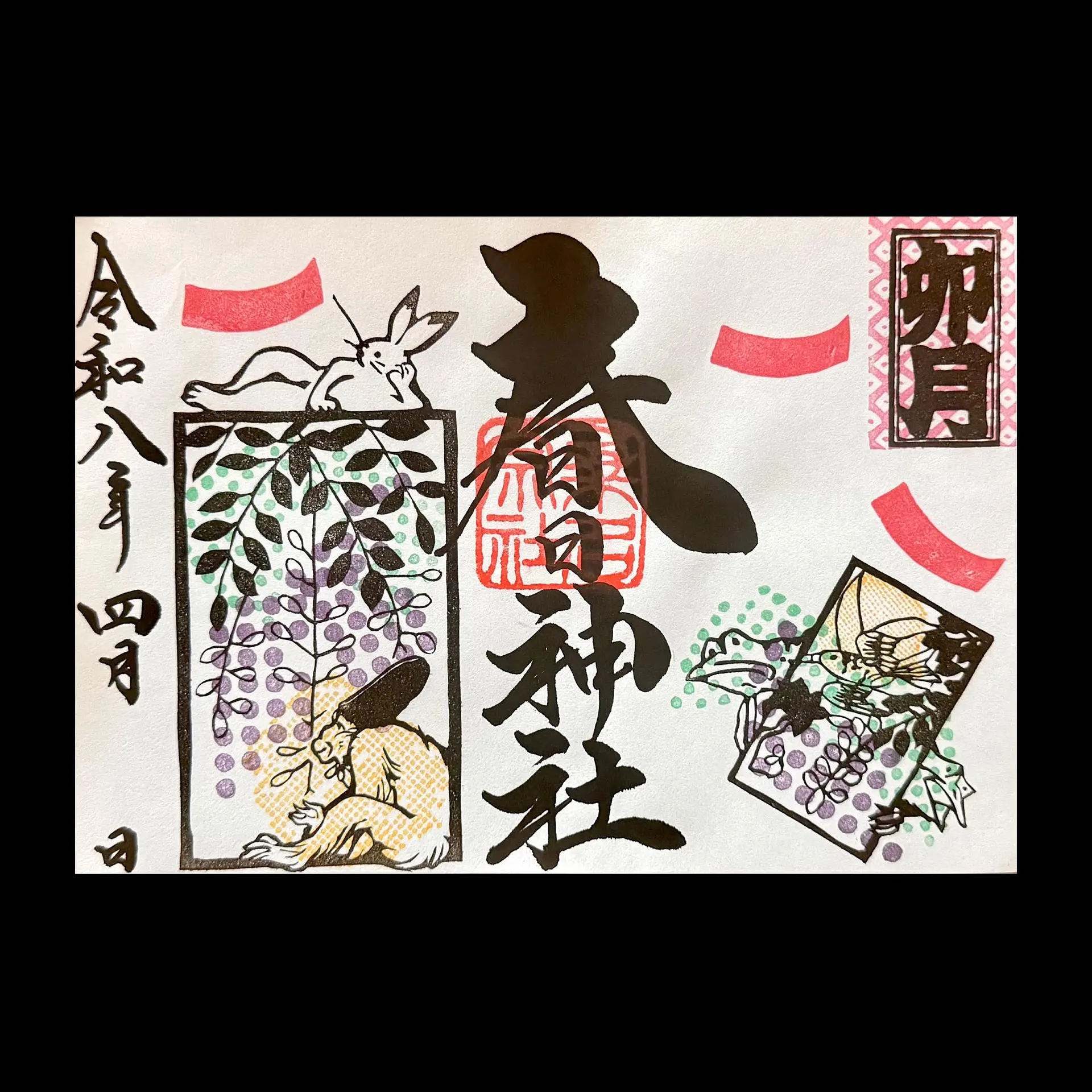 4月の限定御朱印は、はんこやふくちゃんさんとのコラボ御朱印の新シリーズ『天井画(天井絵)』と、消しゴムはんこ作家の#mikax_mfg.co.ltdさんとのコラボ御朱印の『鳥獣戯画の花札(卯月)』。早春の風物詩である桜とメジロが中央の円の中に描かれ、社寺の天井に描かれた絵のようなデザイン。また、鳥獣戯画のシリーズには烏帽子を被り笏を持った宮司が登場!