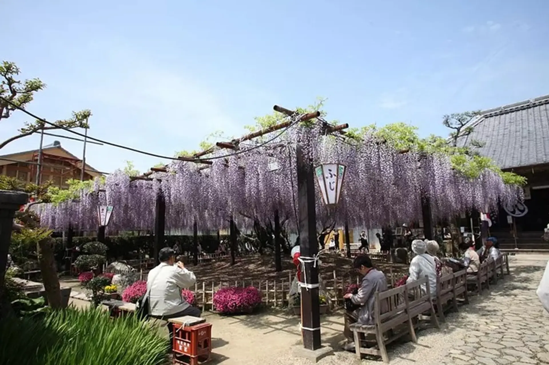 樹齢130 年の藤の木には、1メートル以上もある長い花房が豪華なシャンデリアのように垂れ下がります。 境内は、淡い紫色の花から甘い香りが漂って、華やかな雰囲気に包まれます。ベンチに座って、風に揺れる藤の花をお楽しみください。
