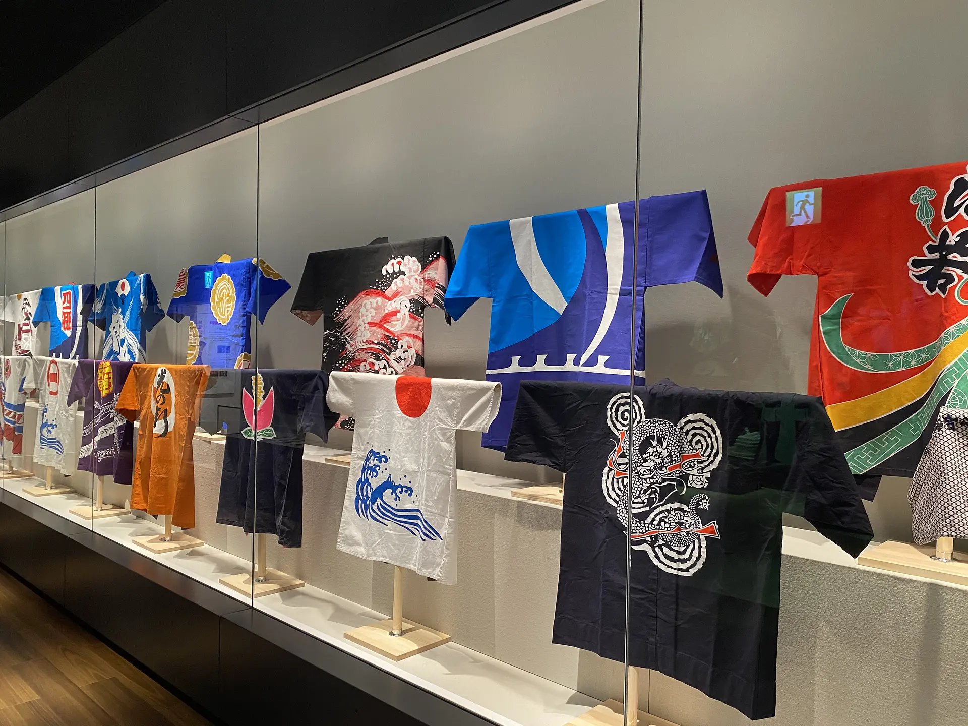 特別展のスタートは、川曳に参加する地域や組ごとのデザインが施された、色とりどりの法被が展示されています。伊勢市内の各地域を象徴するデザインは、地域の誇りと郷土愛が感じられ、お木曳行事への想いが伝わってきます。
