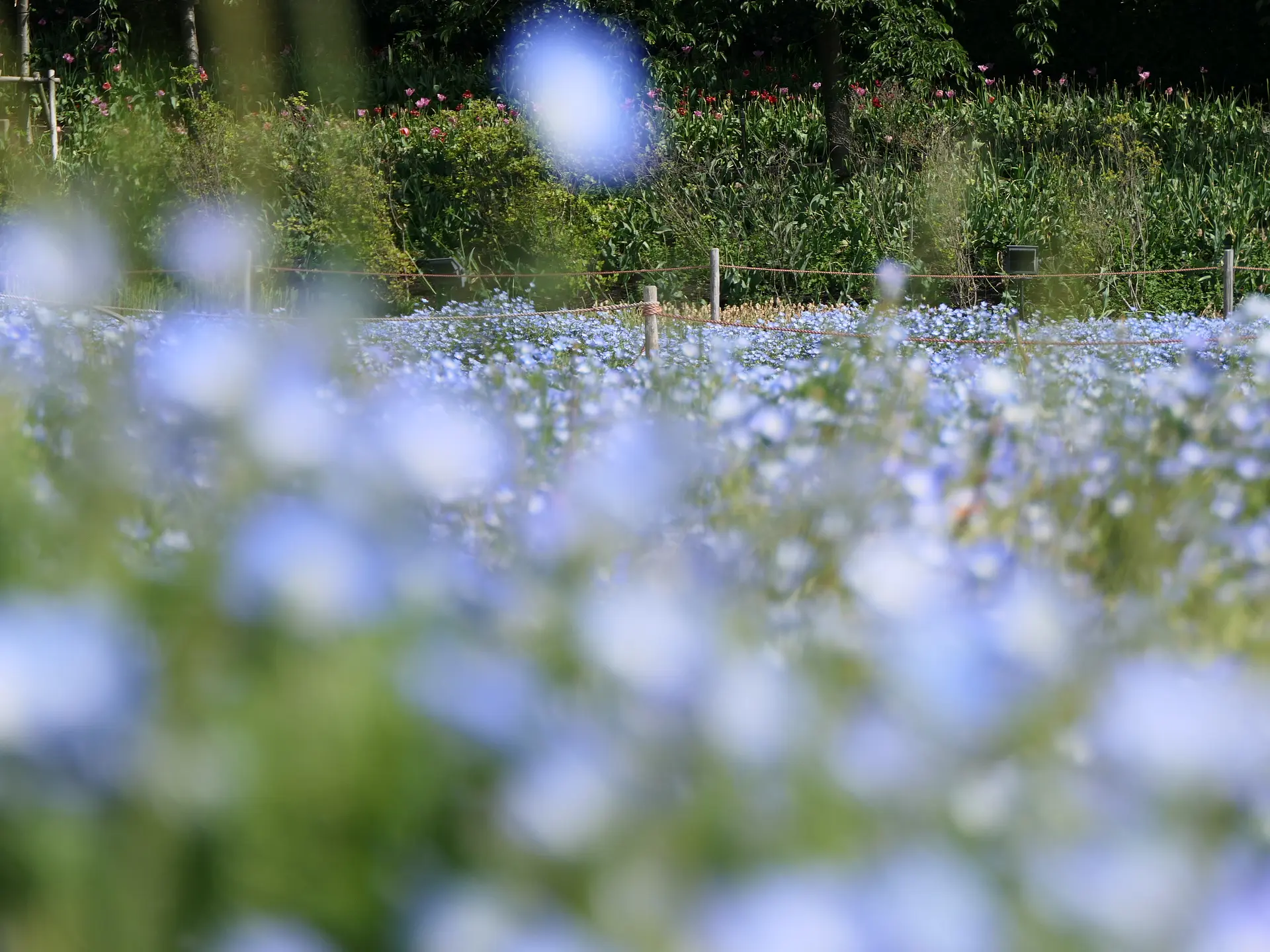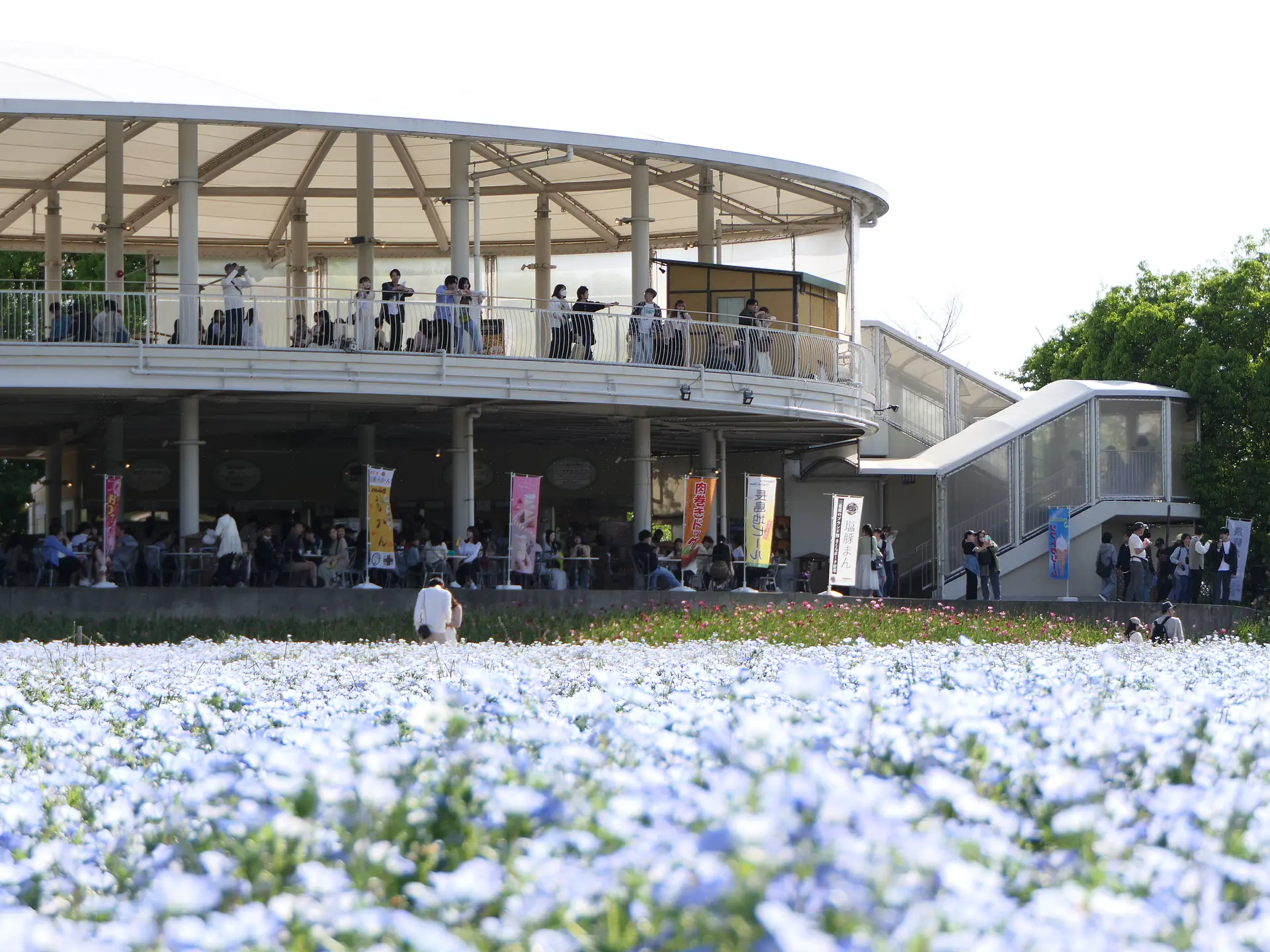 チューリップまつりの後に始まるネモフィラまつりでは、広大な花ひろばがやさしいブルーに包まれます。