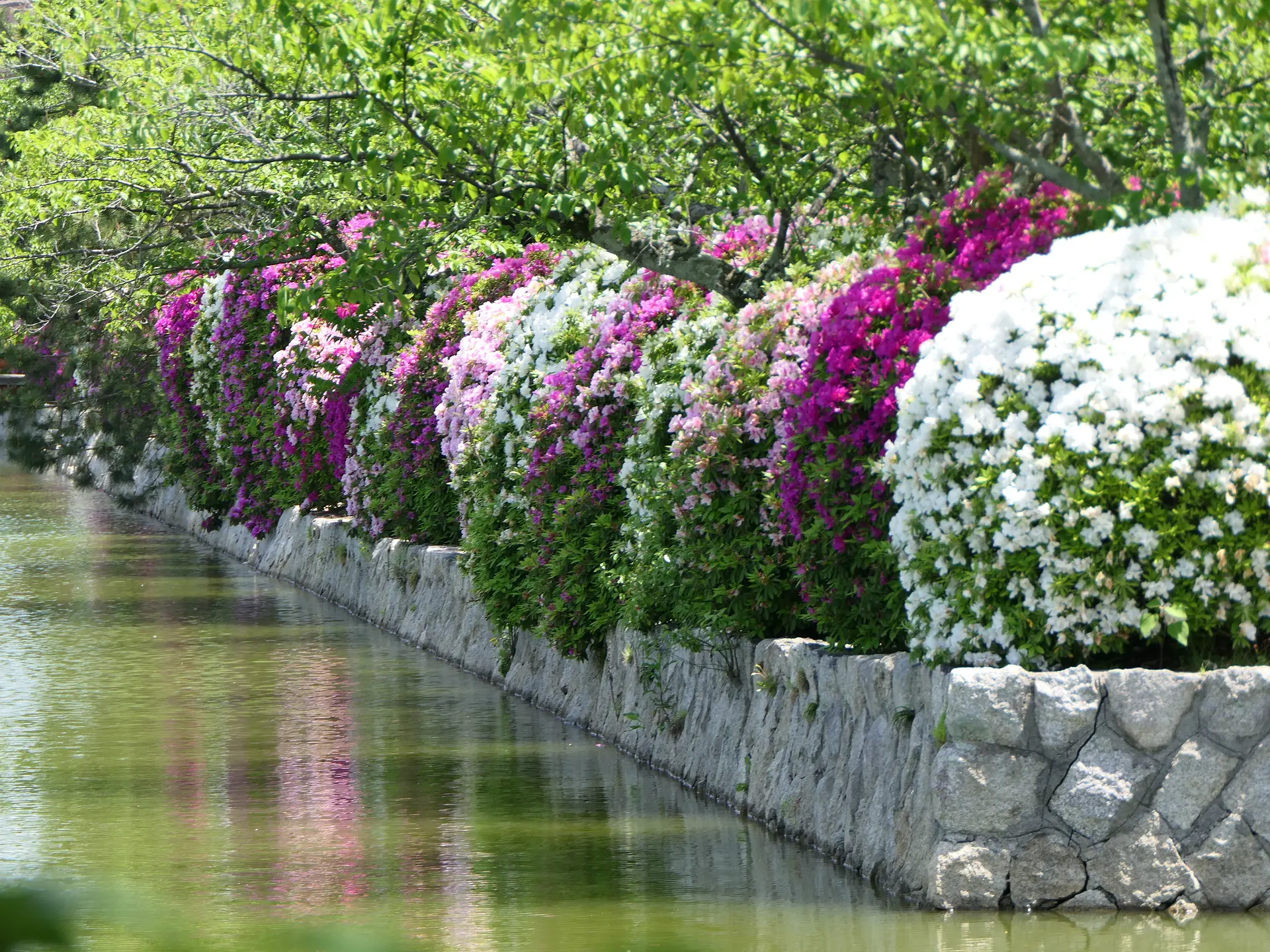 桑名城跡に整備された九華公園では、赤やピンク、白など色鮮やかなつつじが園内を彩ります。