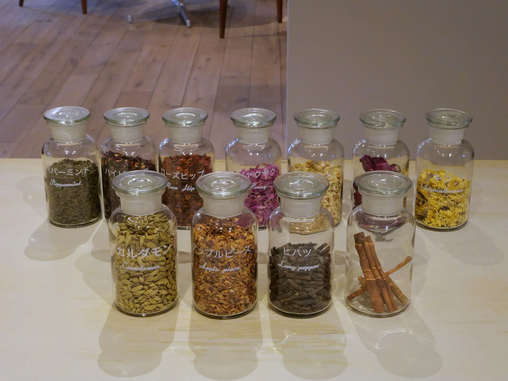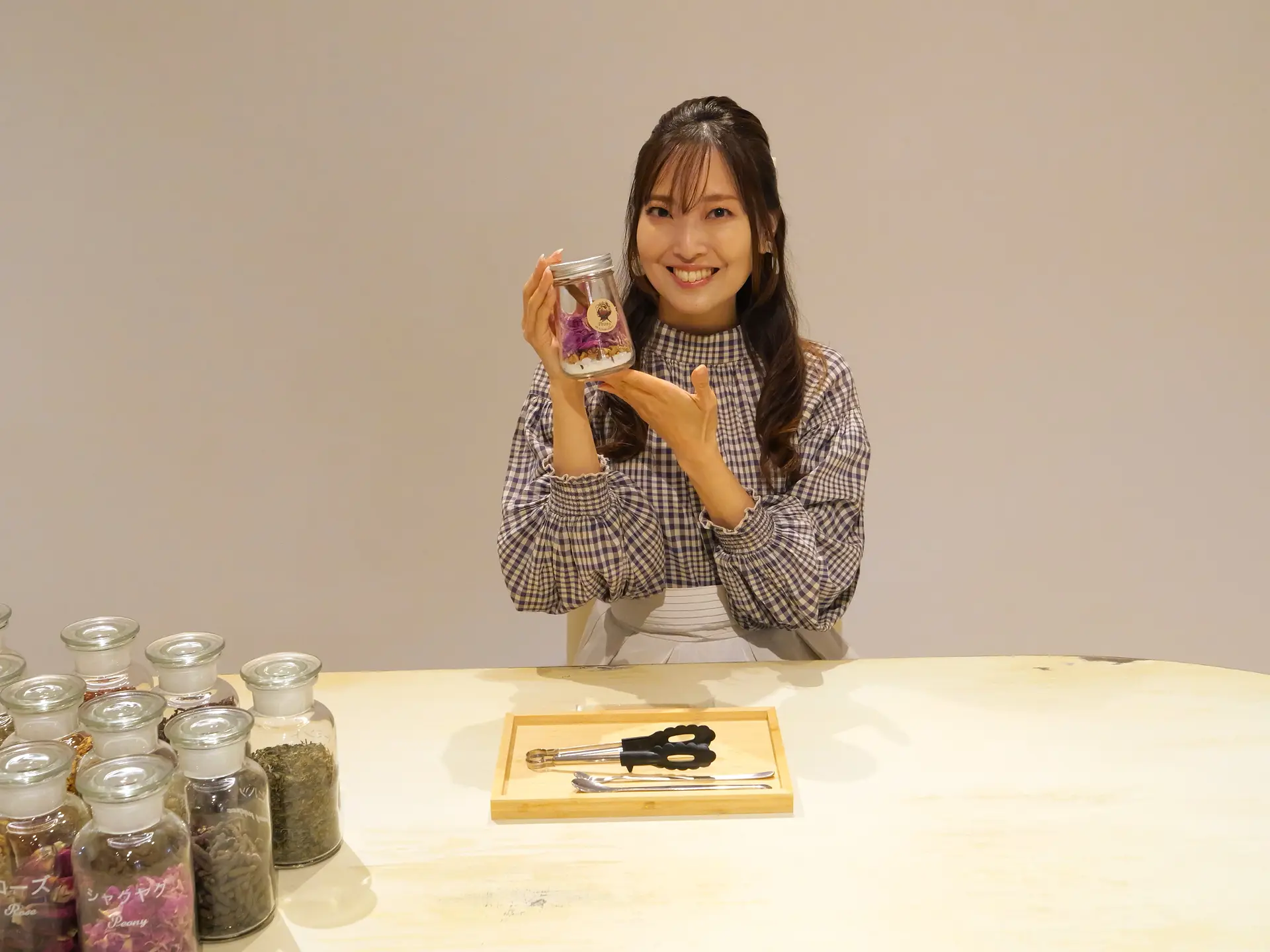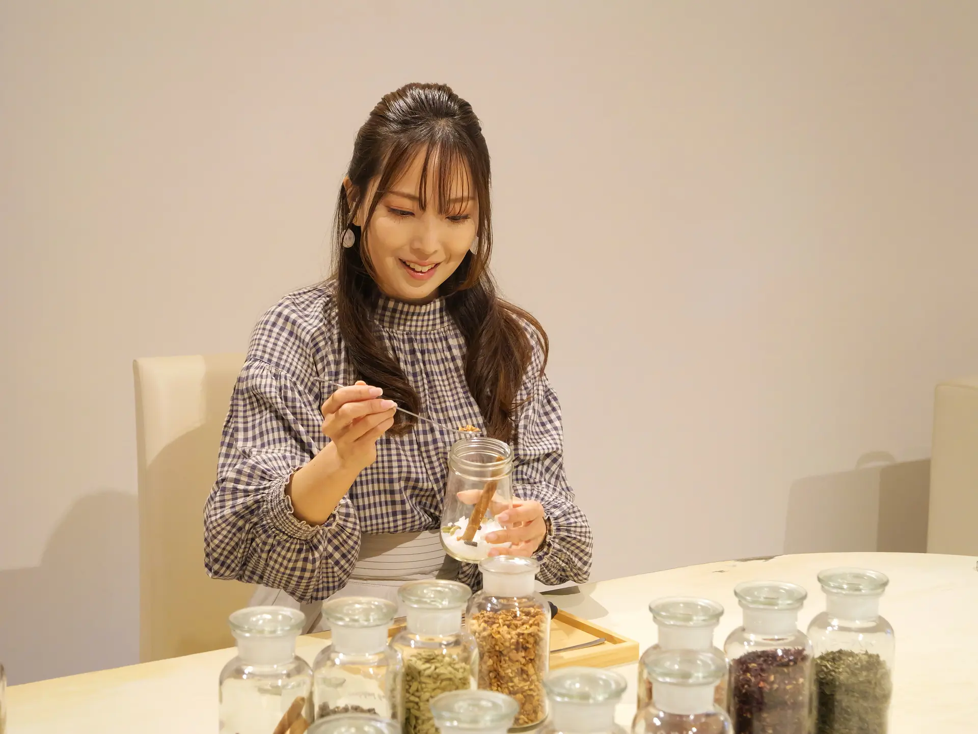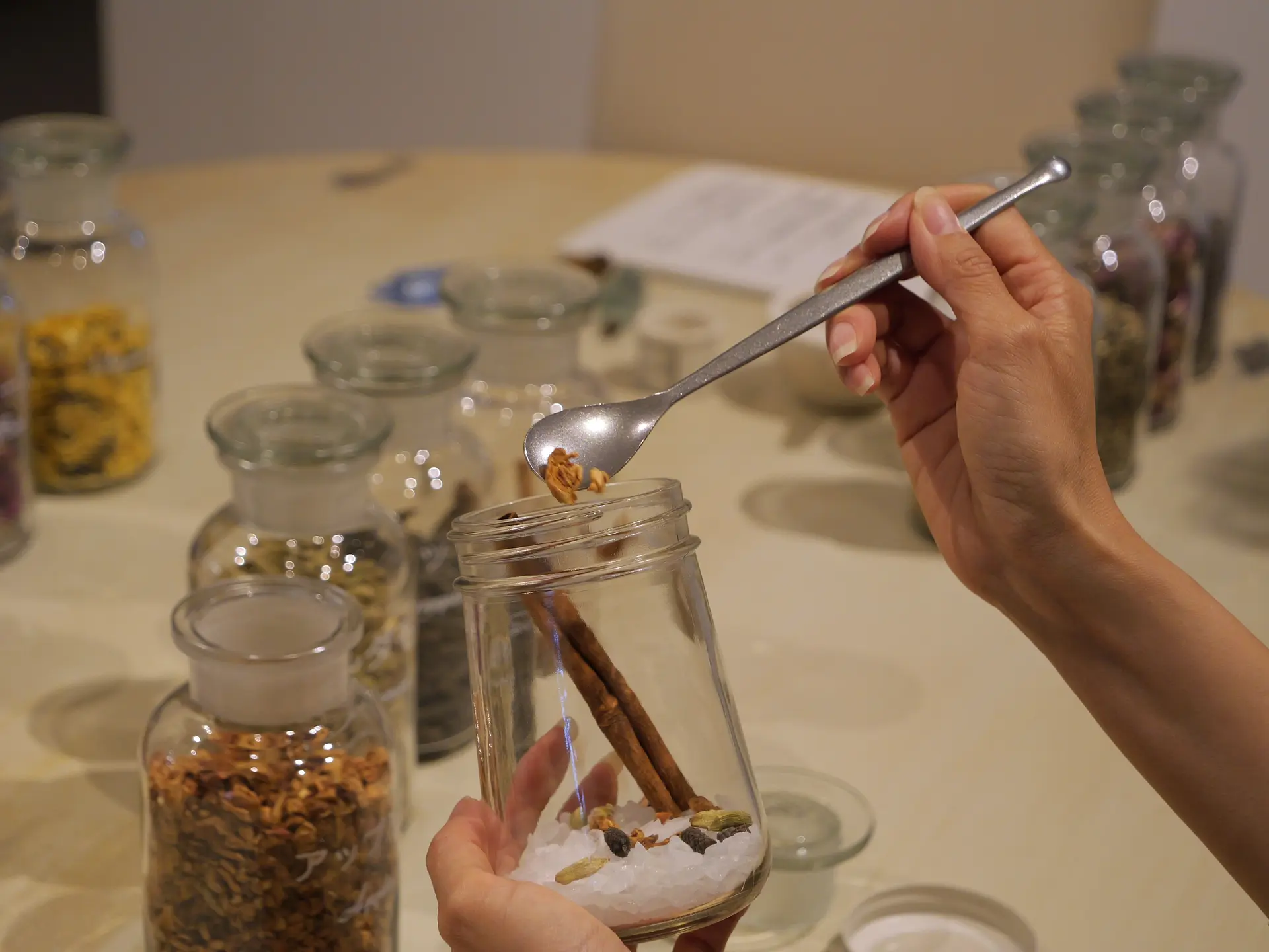 瓶の中に色とりどりのハーブを入れていく様子は見た目にも華やかで、香りを楽しみながら進める癒やしのひとときです。