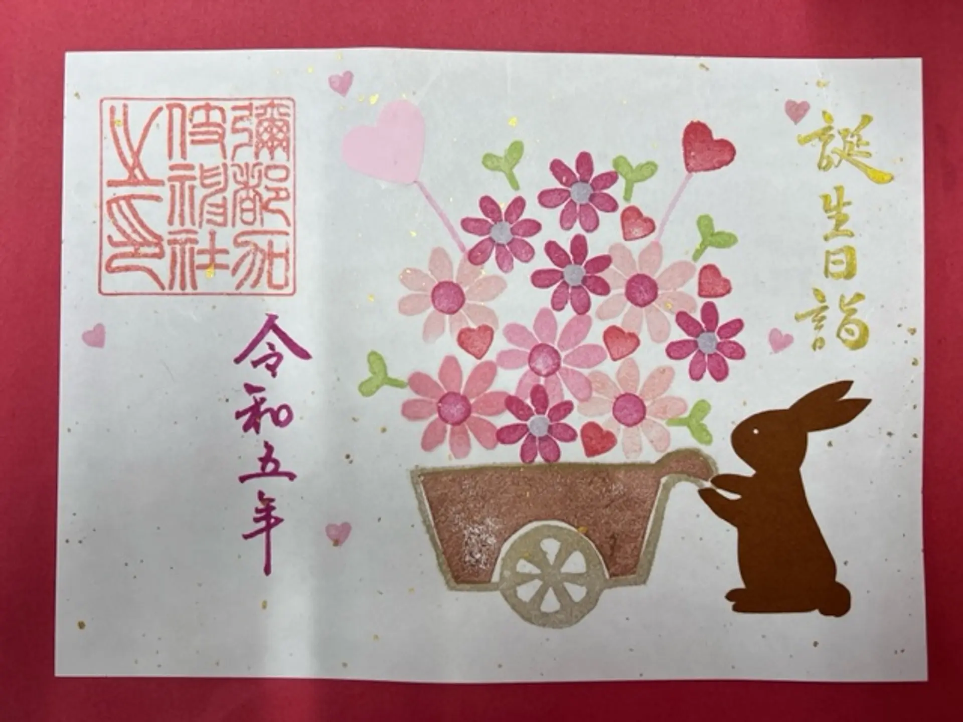 また、鈴鹿市伝統の無形文化財である伊勢型紙がワンポイントに使用されています。7月生まれの方には誕生日御朱印も。花いっぱいの花車をひいたうさぎさんが、あなたの誕生日を御祝してくれますよ。
