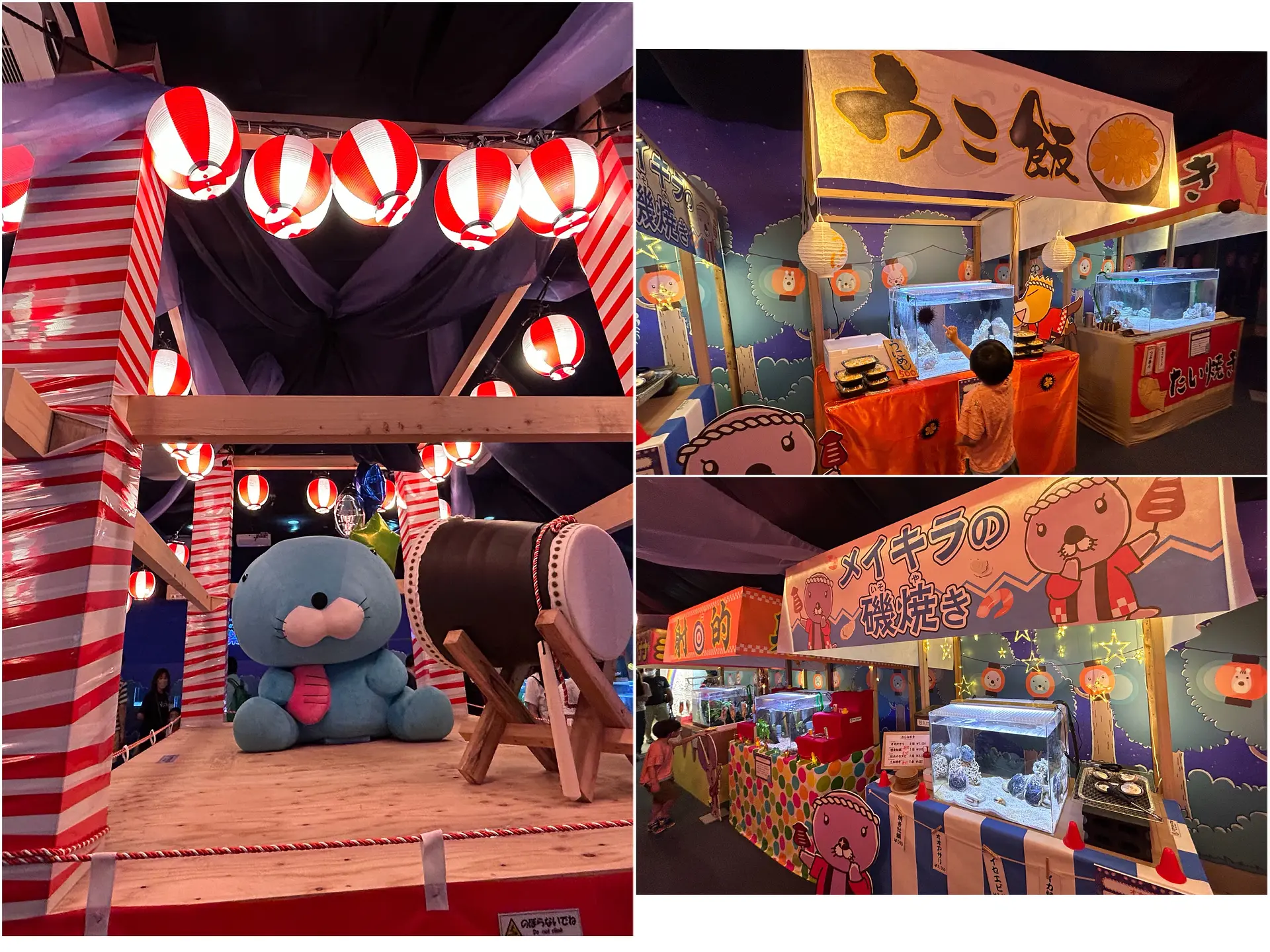 中心では ぼのぼのが太鼓をたたき、ぼのぼのの仲間たちがそれぞれ楽しい屋台をしています。普段の夏祭りの屋台とは全然違い、すべての屋台に本物の生きものが!