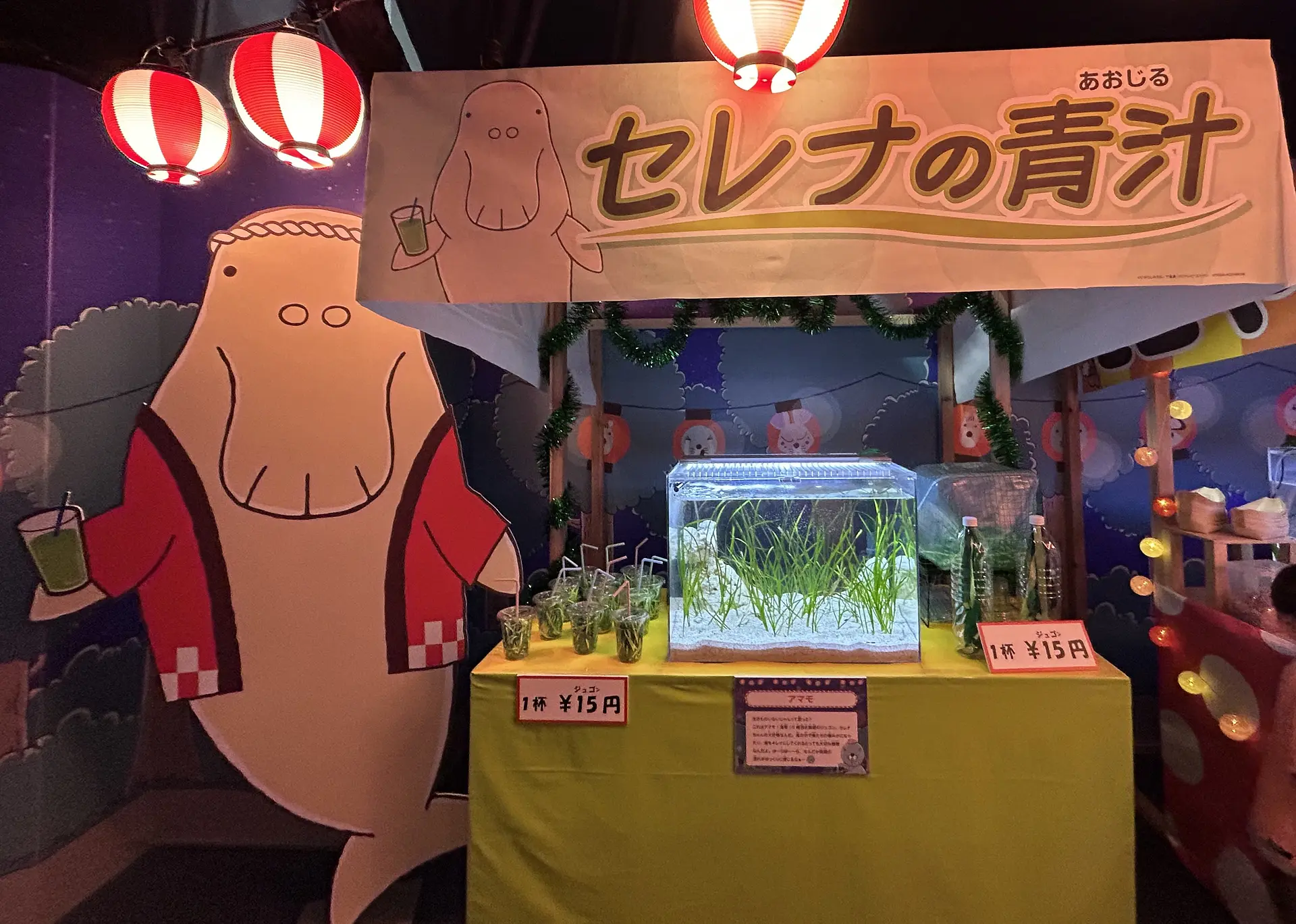 セレナちゃんが売っているのは、その名も「セレナの青汁」。セレナちゃんの大好物「アマモ」の青汁です。お値段は1杯15(ジュゴン)円!