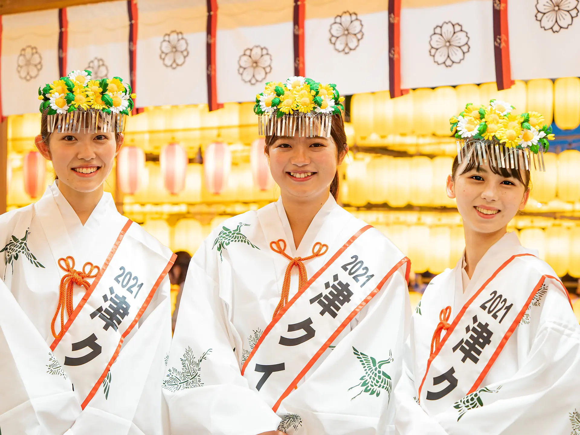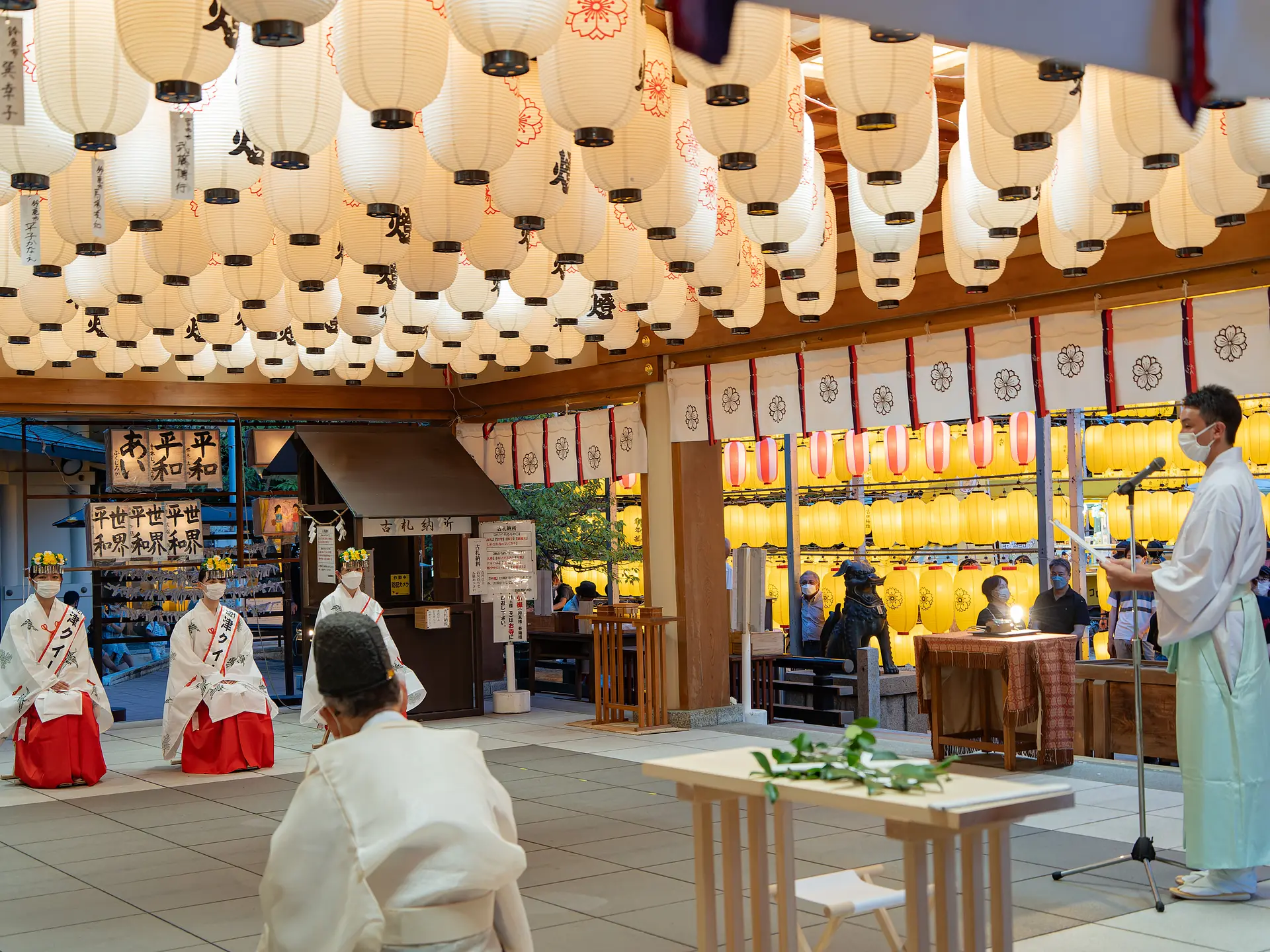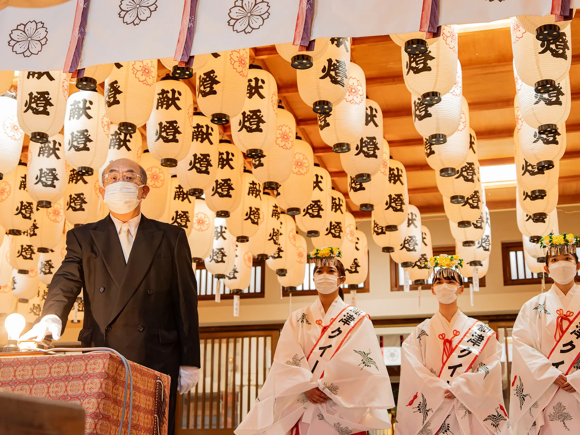 13日18:30からは、提灯の点灯式が行われます。拝殿で津クイーン(名誉巫女)が奉仕の上で、神事が行われた後、協賛会長が提灯の点灯ボタンを押します。一斉に点灯となる瞬間は、思わず歓声があがります。