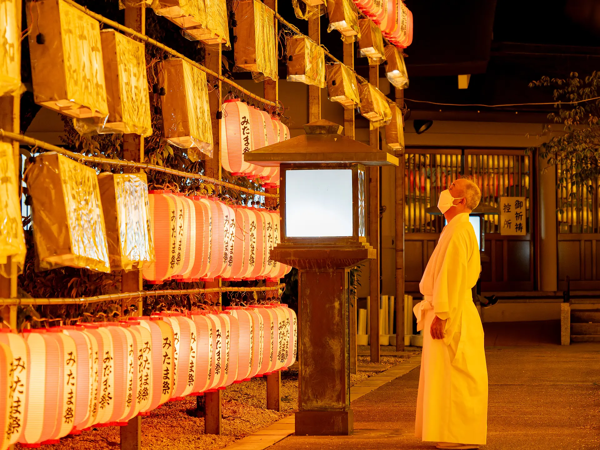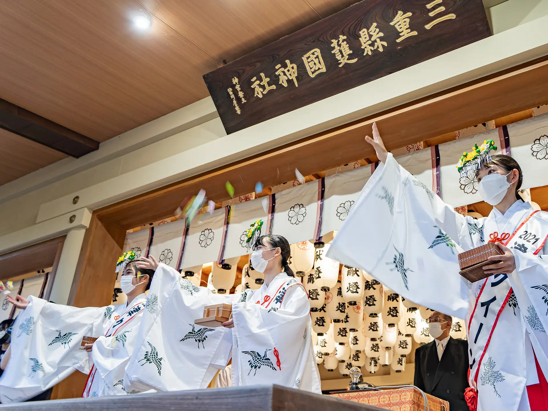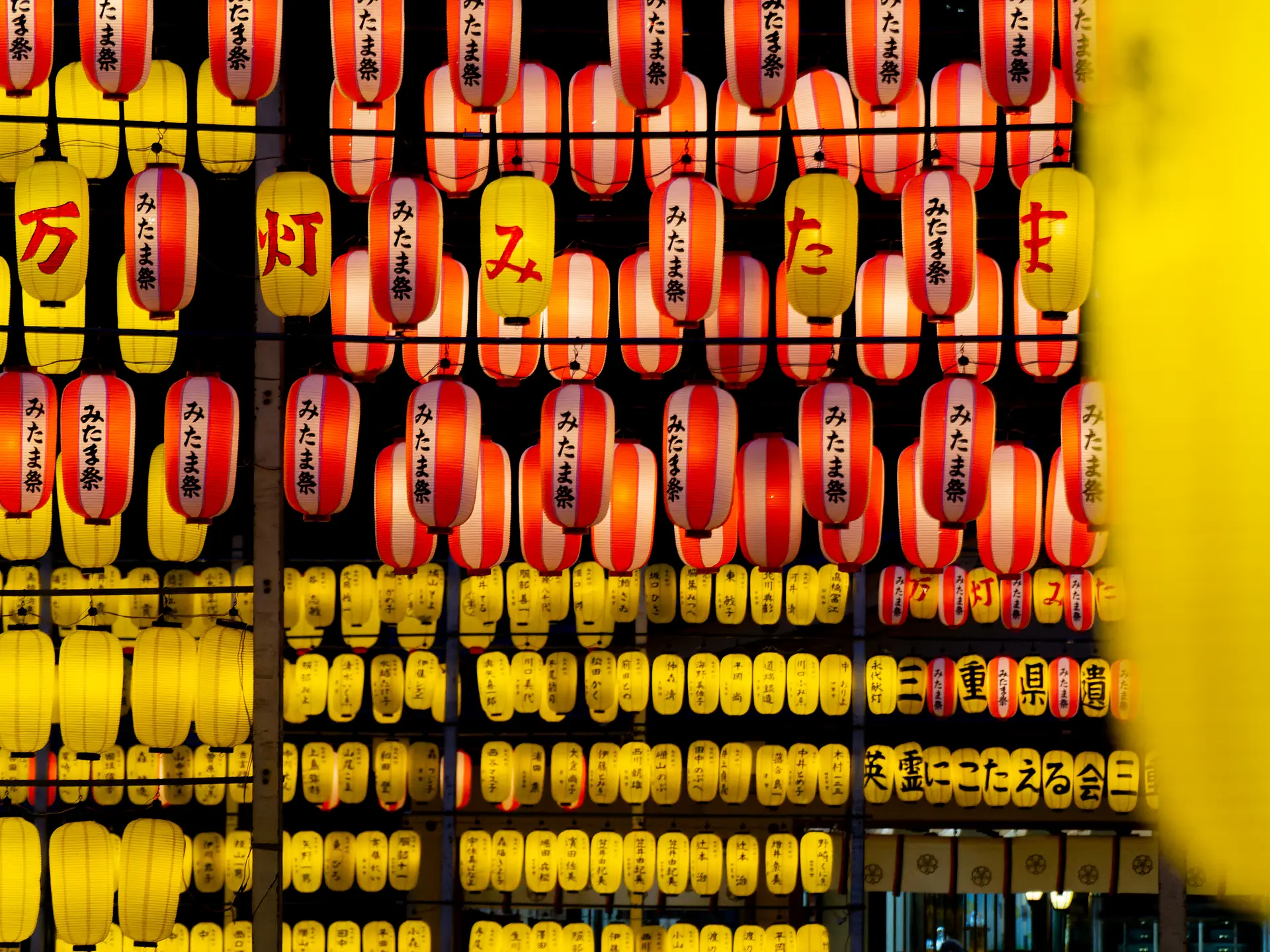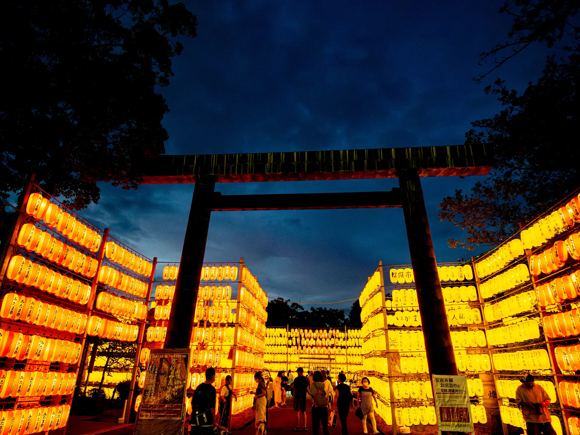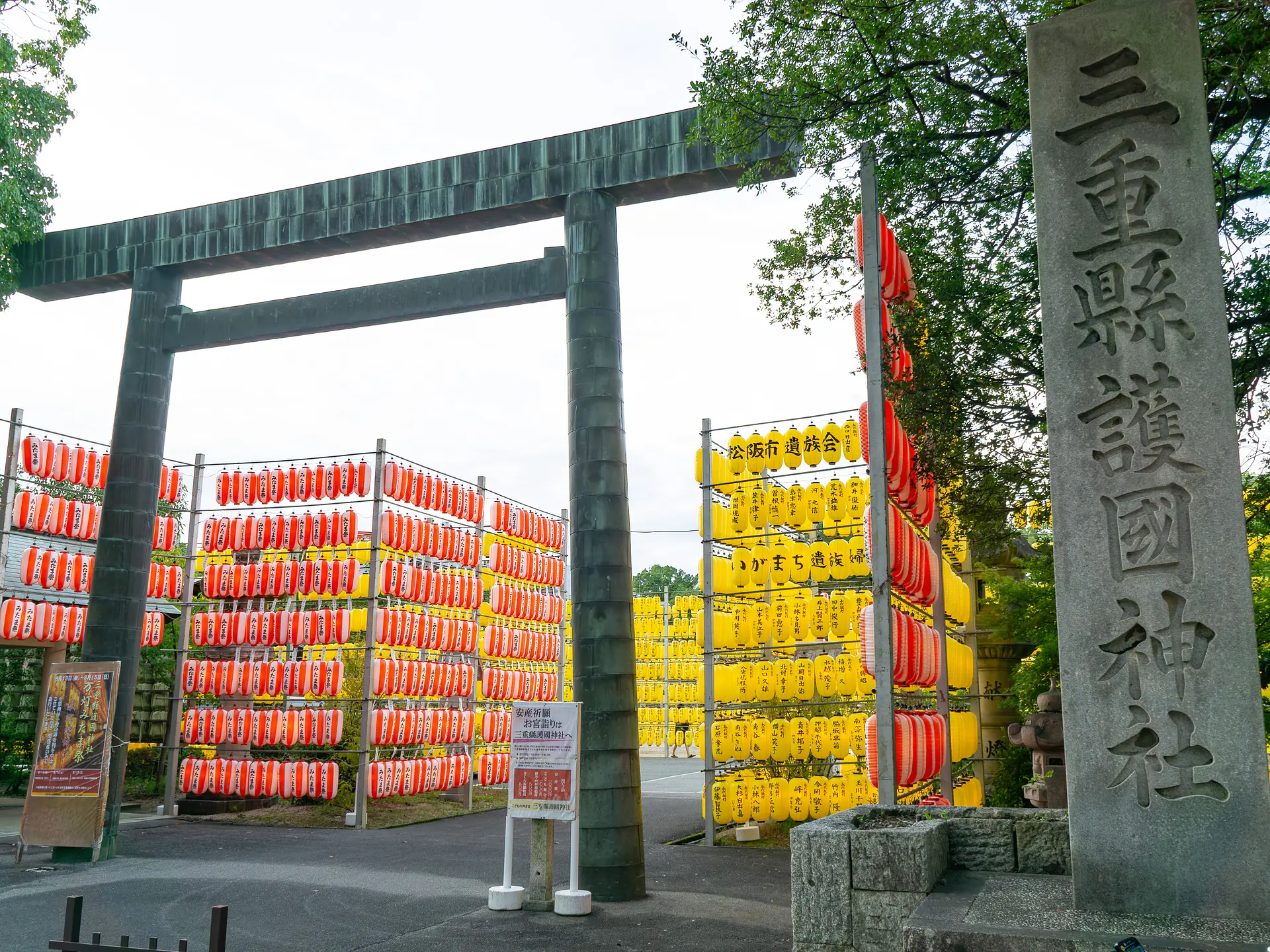 三重縣護國神社(三重県護国神社)で毎年行われる「万灯みたま祭」は、境内に約6,000灯の提灯・行灯が掲げられ、ご祭神である御英霊のみたまを慰める同神社の夏のお祭りです。中央の拝殿では白の提灯、中央の参道を中心とする一体には紅白と黄色の提灯が掲げられます。たくさんの提灯が奏でる幻想的な光景は、平和と繁栄への願いと感謝を思い起こさせられます。
