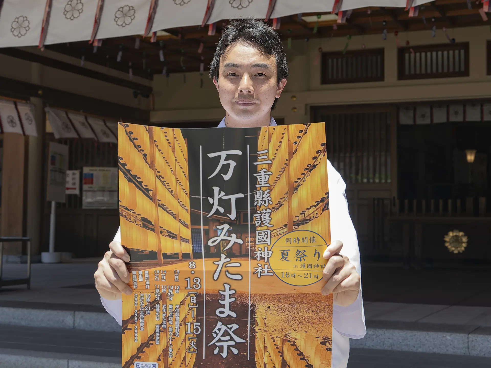万灯みたま祭を通じて、皆様に三重縣護國神社を知っていただき、お参りいただくきっかけとなっていただければとお話する権禰宜の山口さん。