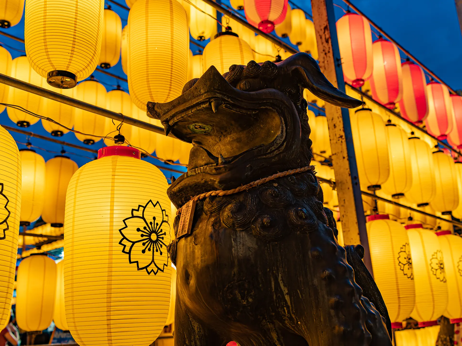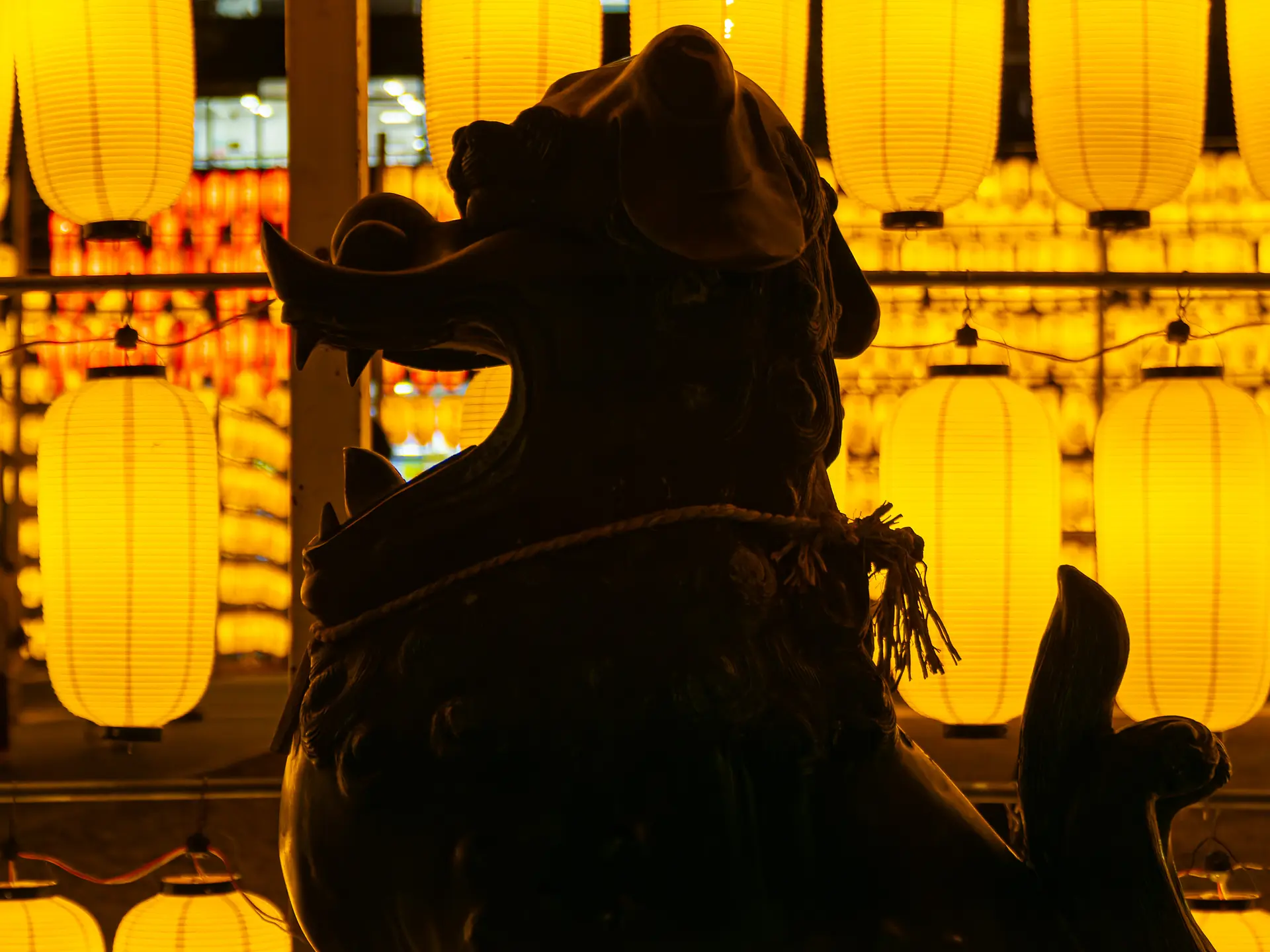 狛犬と提灯を一緒にパシャリ。シルエットで撮ってみたり、ご家族やご友人と一緒に撮ってみては。