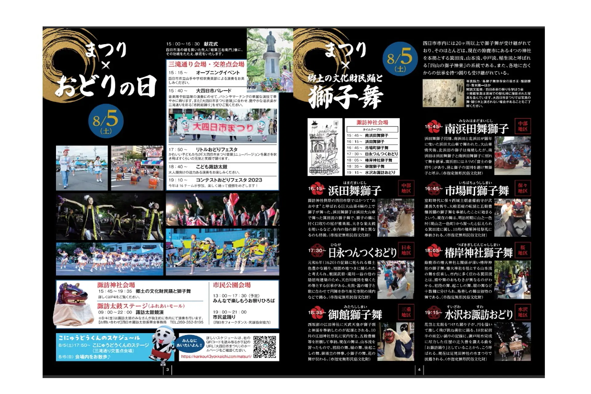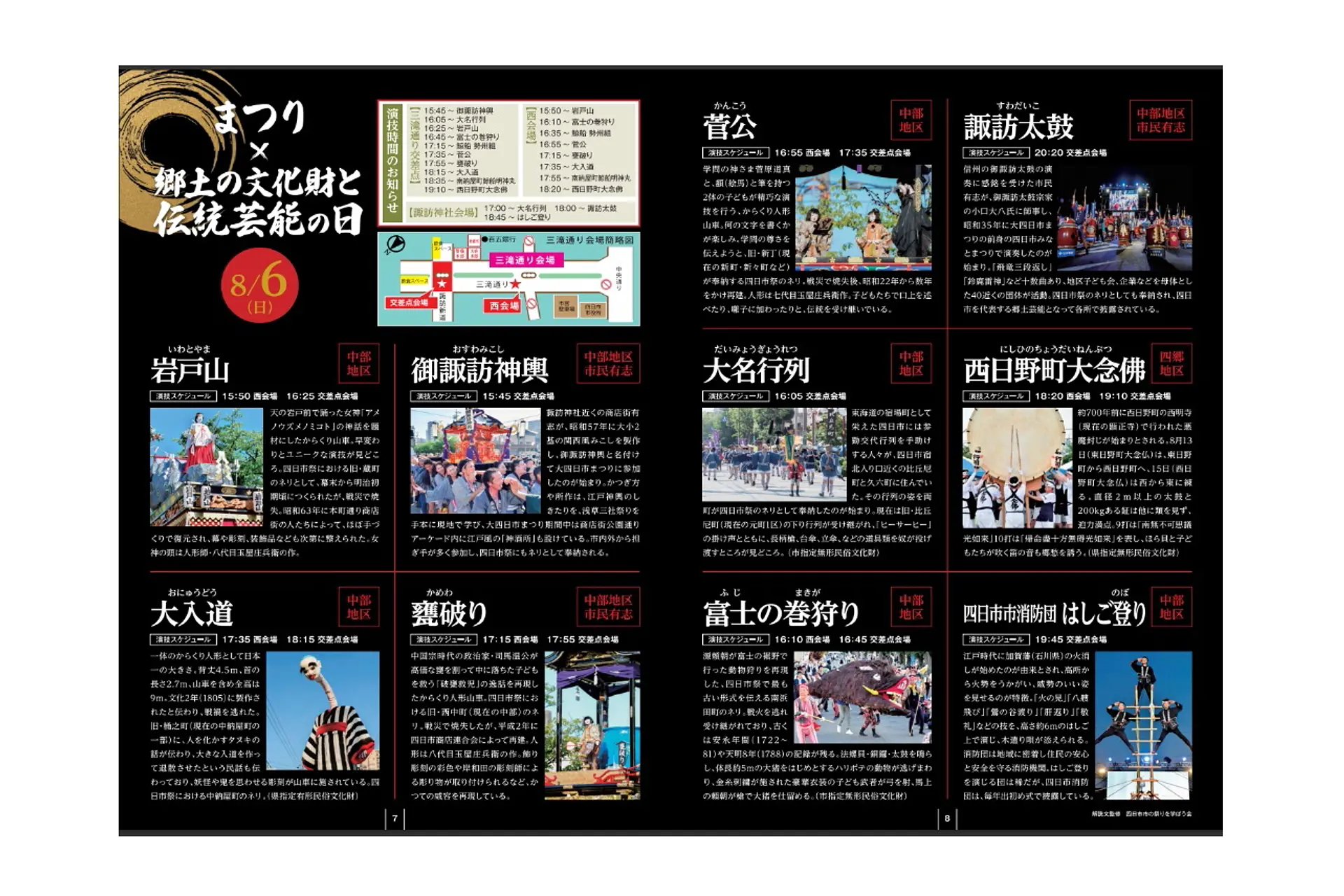 1日目は「おどりの日」としてコンテストおどりフェスタ等のおどりに関するイベントを、2日目は「郷土の文化財と伝統芸能の日」として四日市の山車や祭りなどの文化を楽しむ企画が繰り広げられます。