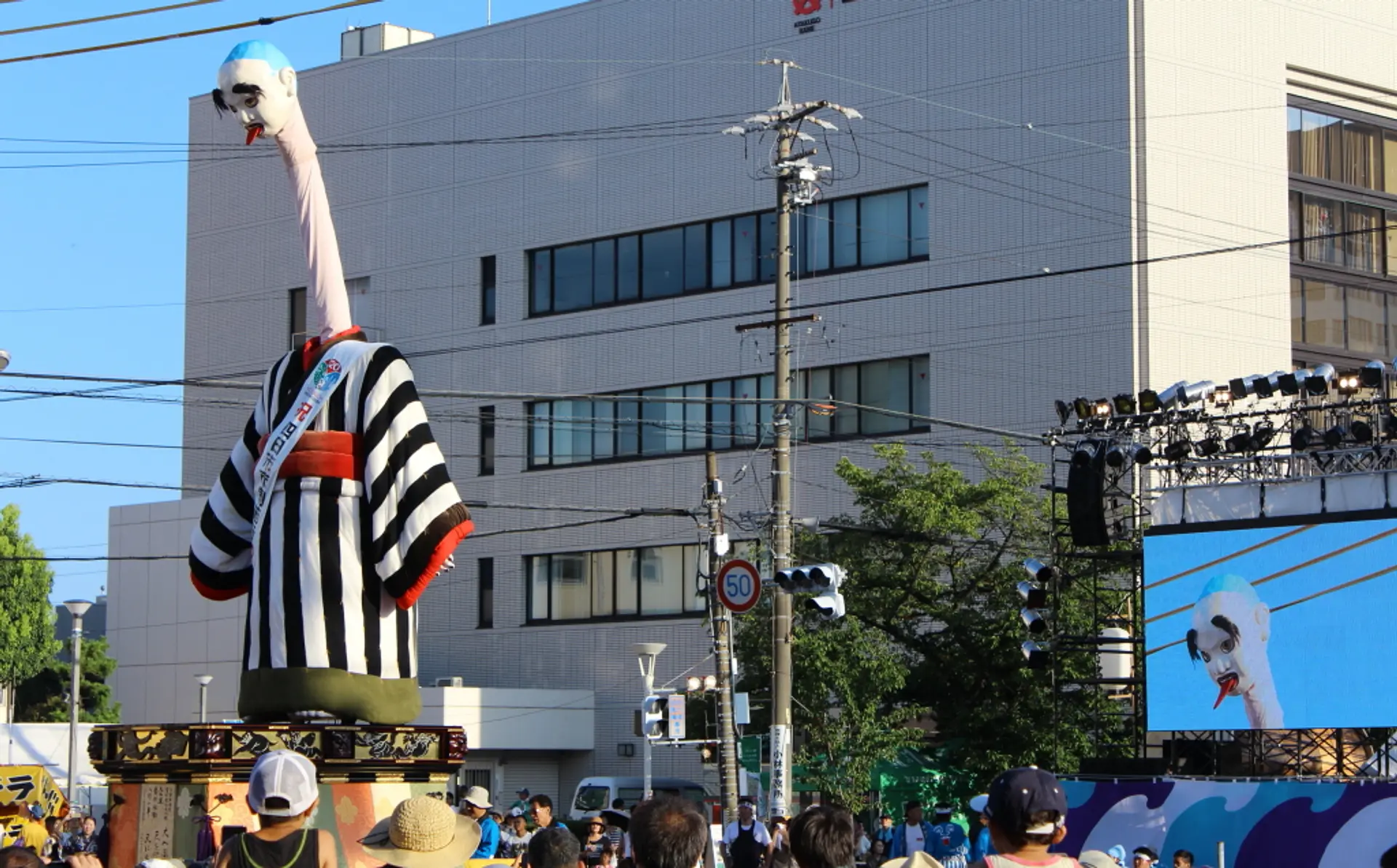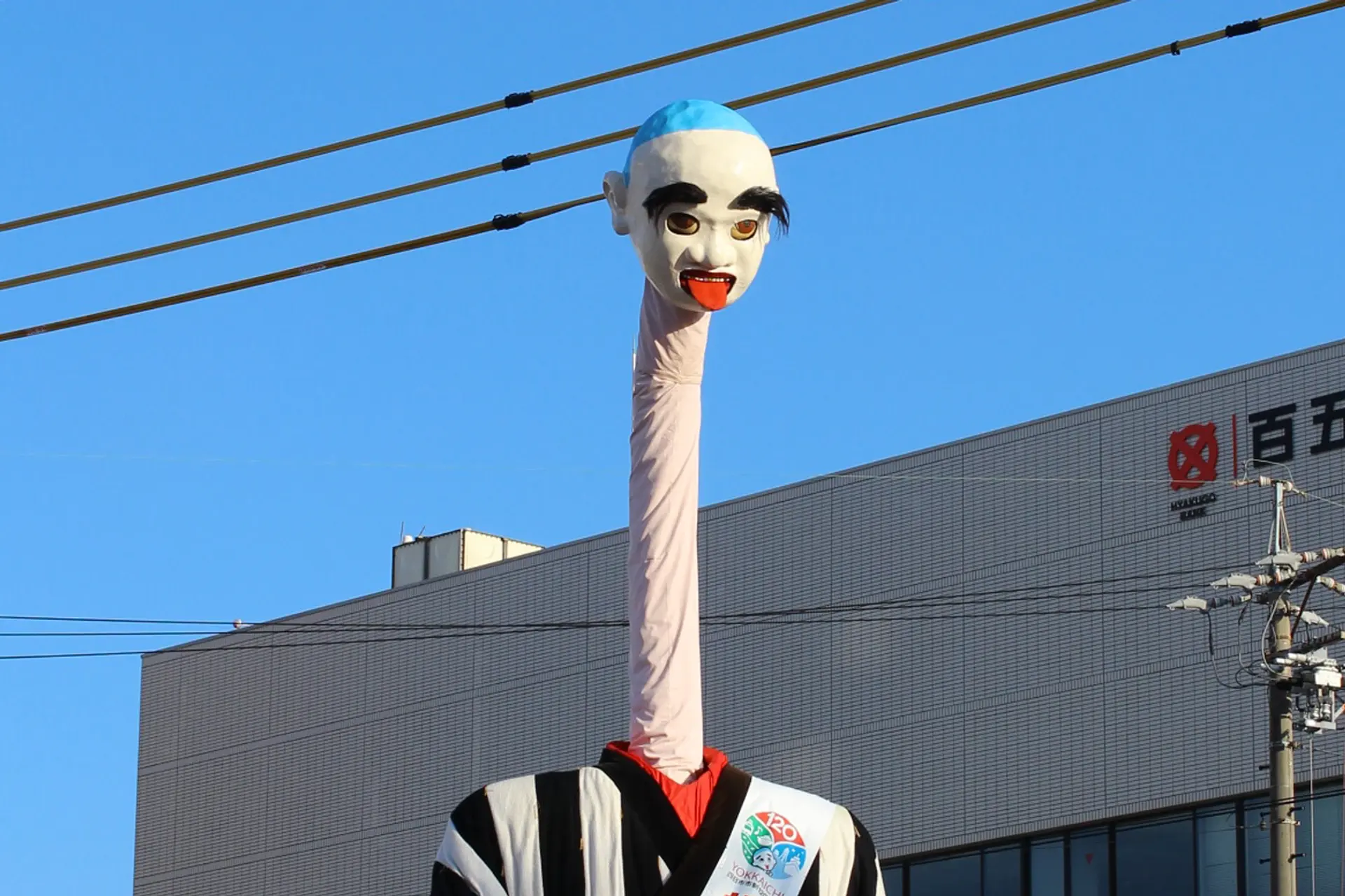 高さ1.8mの山車の上に乗る大入道は、身の丈4.5m、伸び縮みする首の長さ2.7mで、日本一大きなからくり人形ともいわれています。