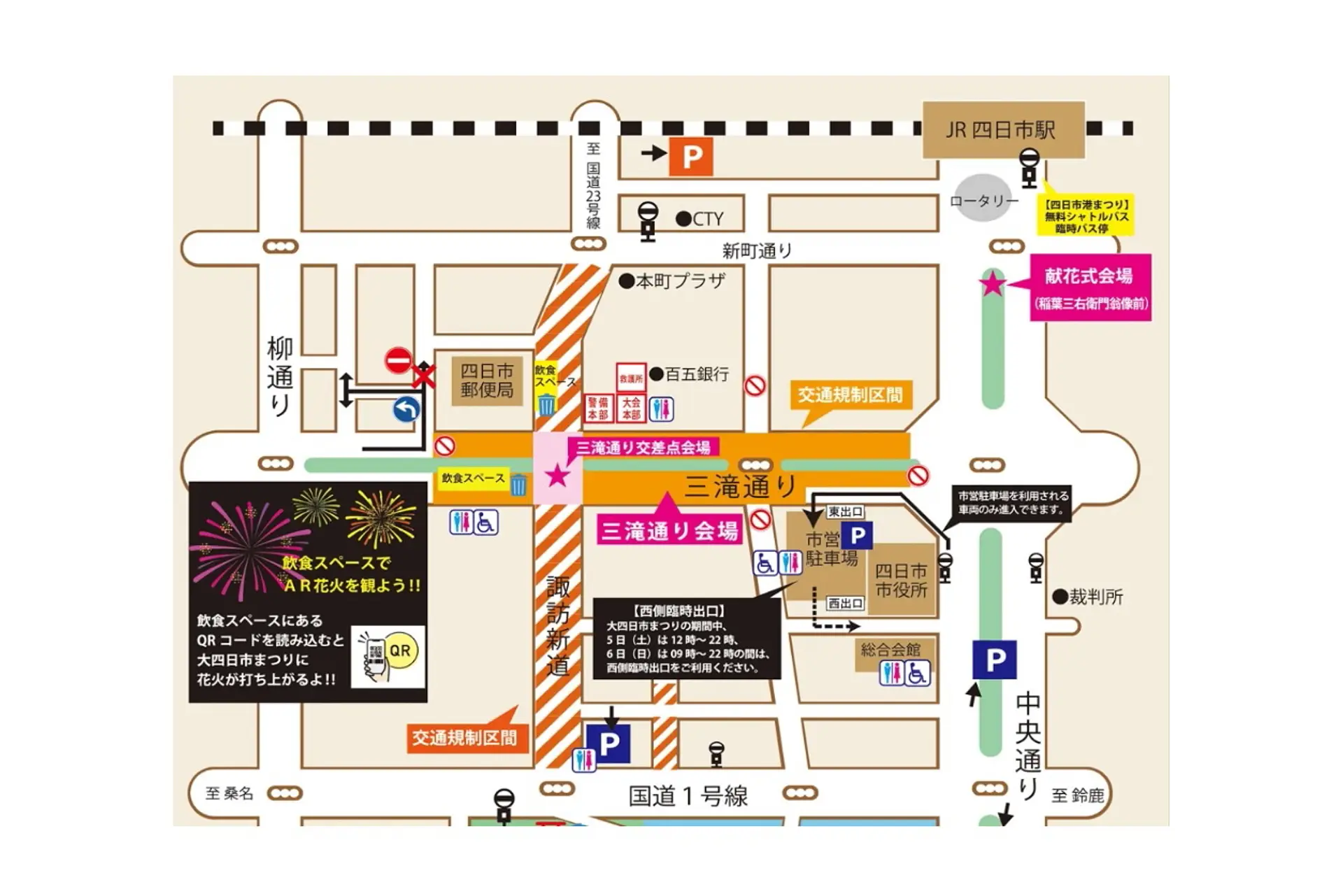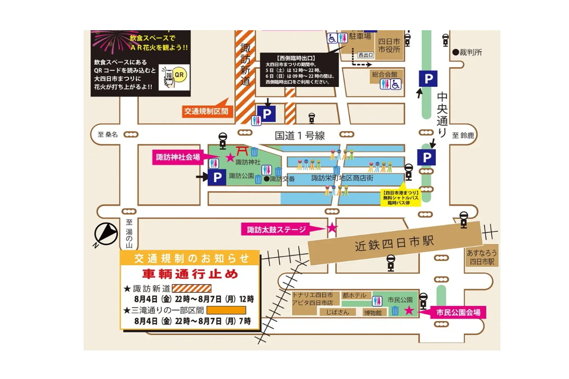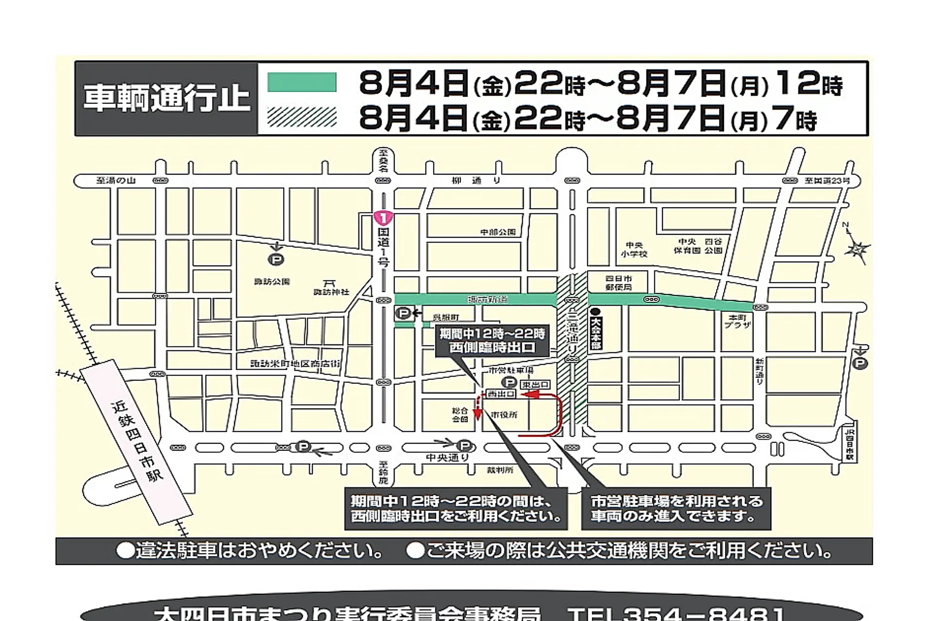 当日会場周辺は混雑が予想されます。近隣に有料駐車場がありますが、大四日市まつり開催の前日の夜から開催翌朝まで、交通規制が実施されます。