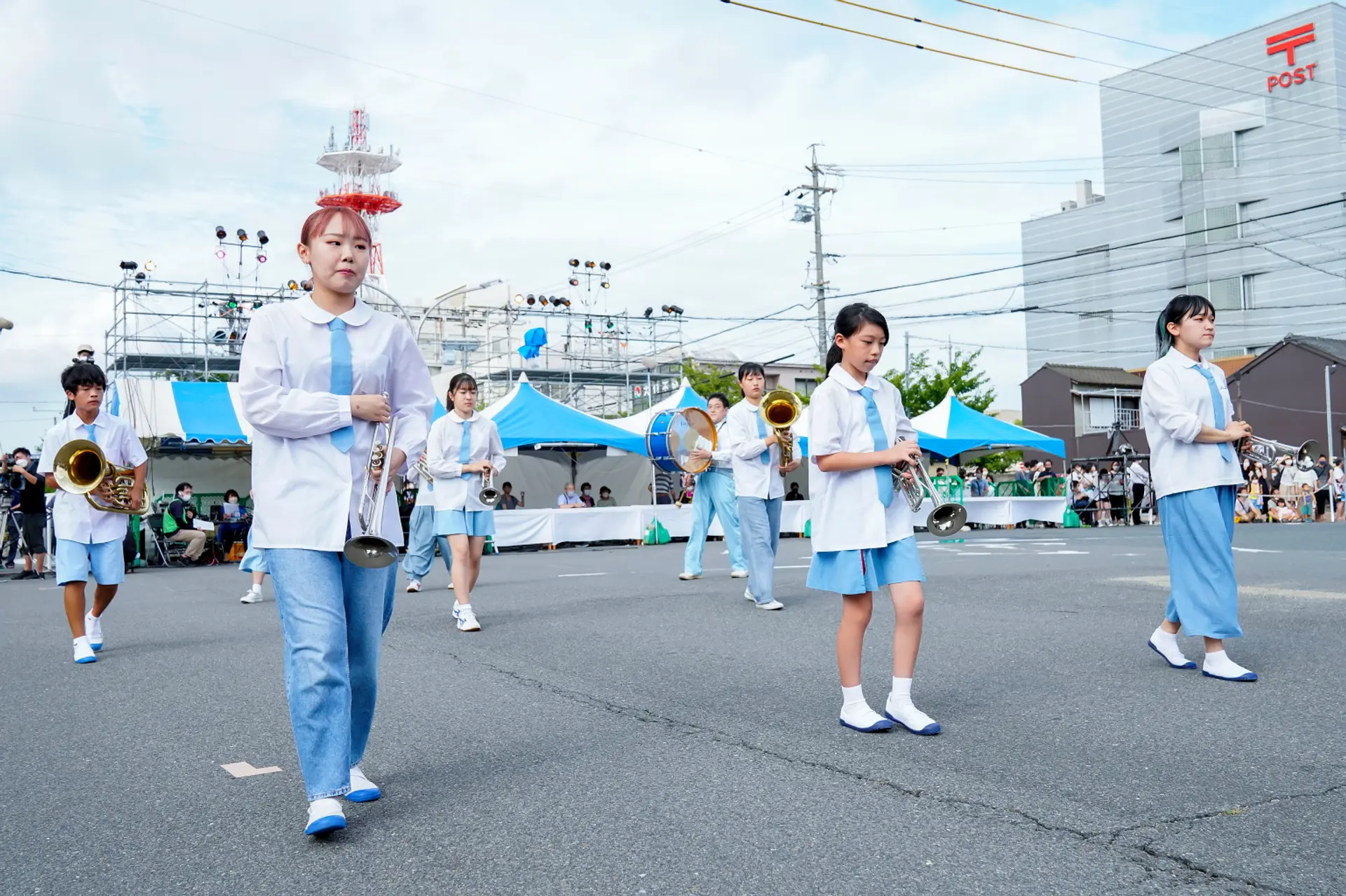 三滝通り会場では、音楽隊や鼓笛隊の演奏とともに、華麗なバトンやマーチングの演技がパレードを華やかに飾ります。