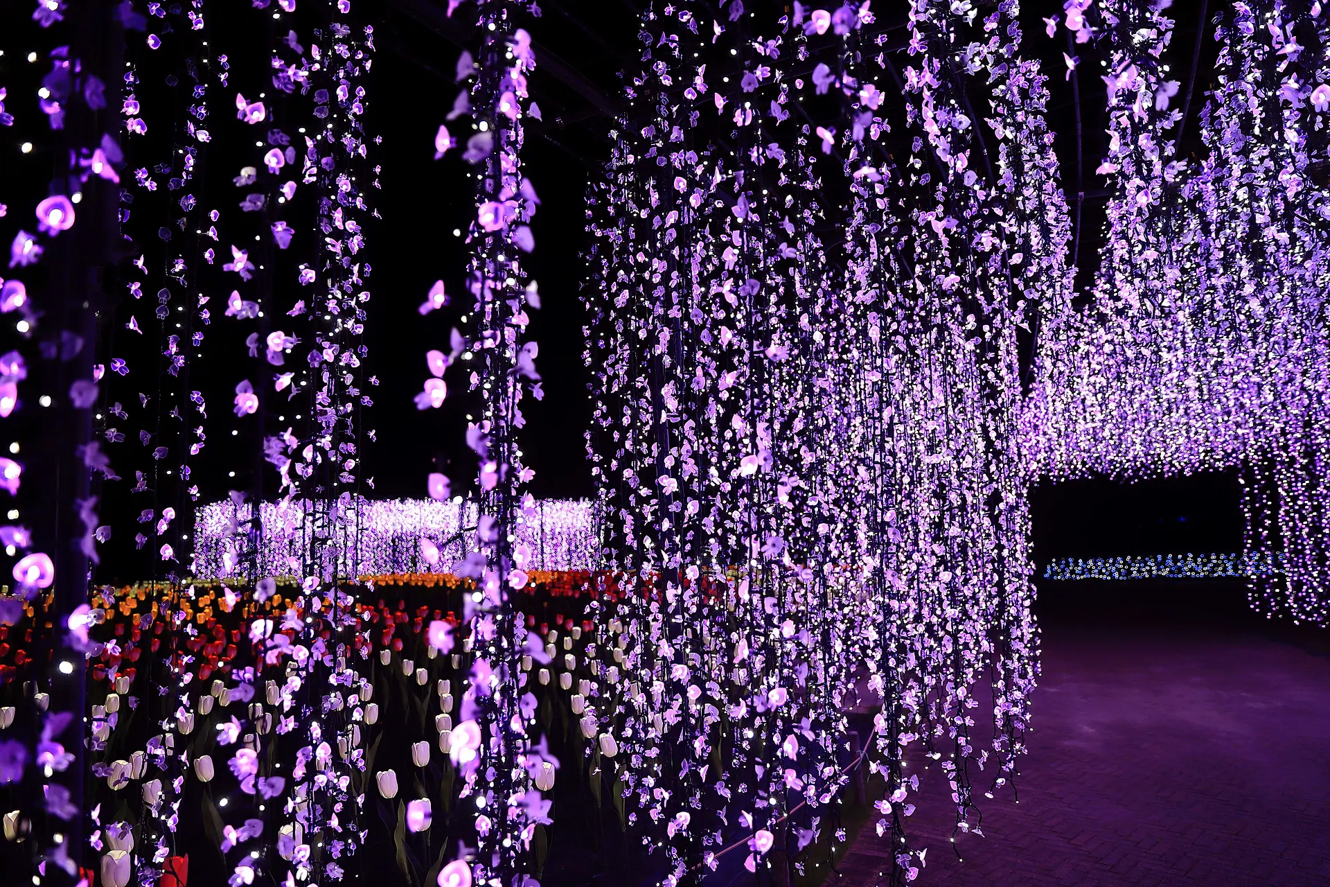 どこまでも続くチューリップ畑に紫と白の流れるカーテンの様なイルミネーション。