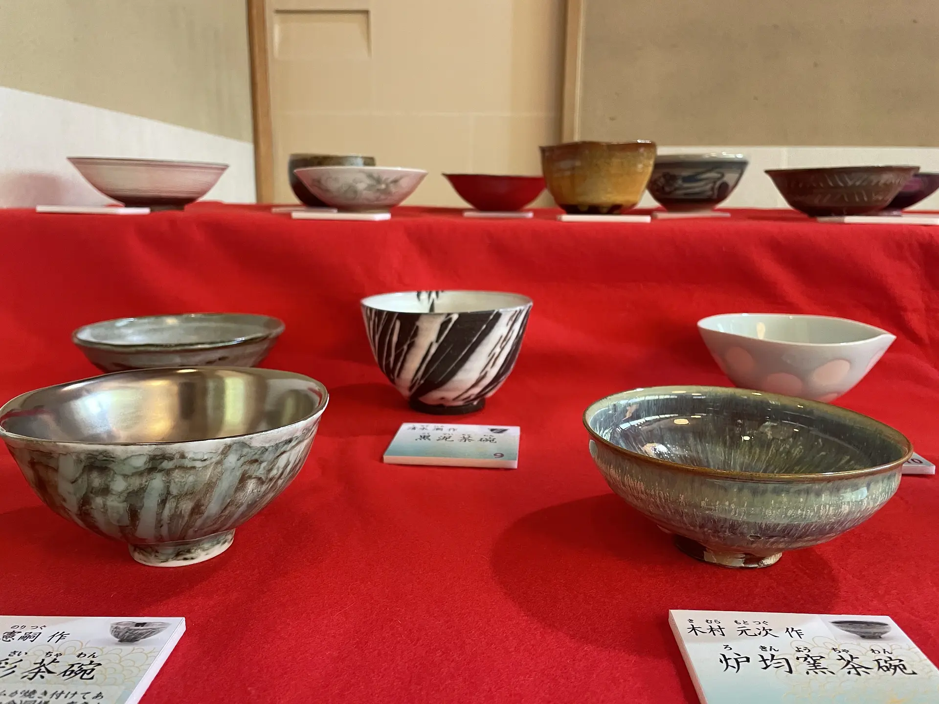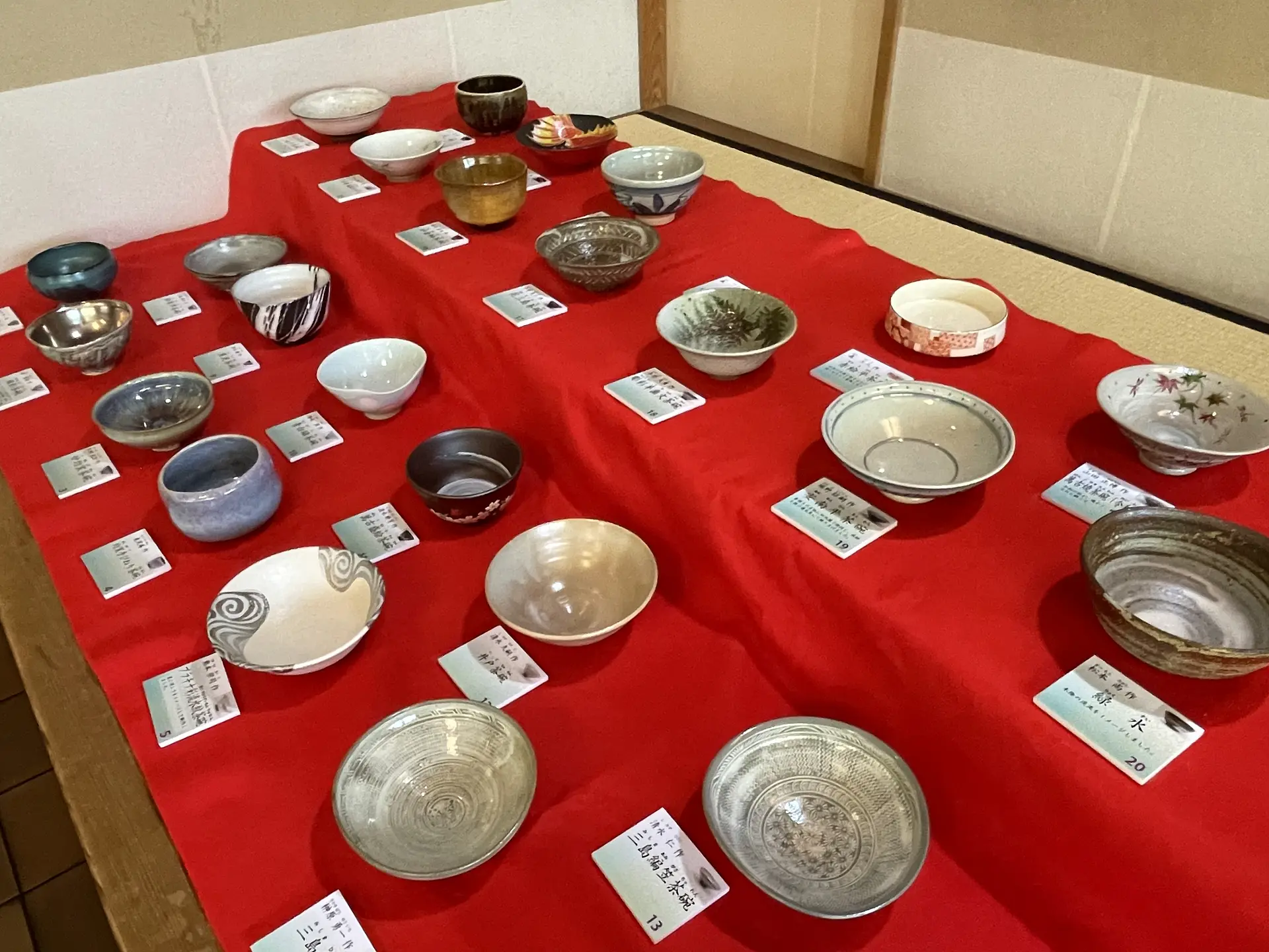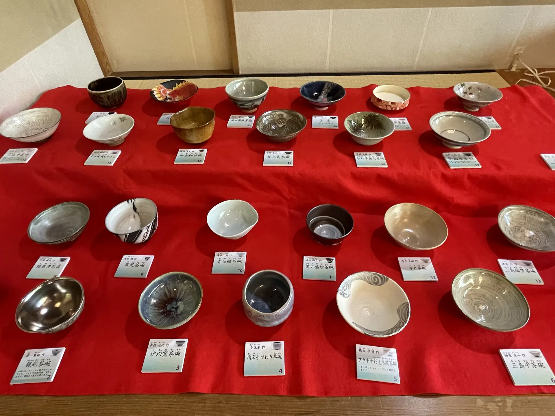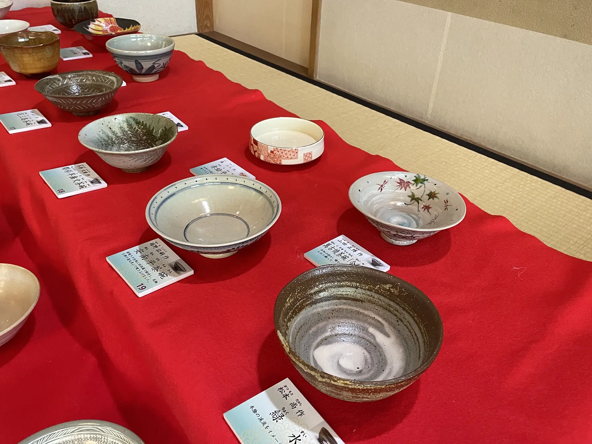 椅子席で気軽に一服できる立礼席には、26名の萬古作家の茶碗が展示されていて、その中から気に入ったものを一つ選んで抹茶を点てて頂きます。