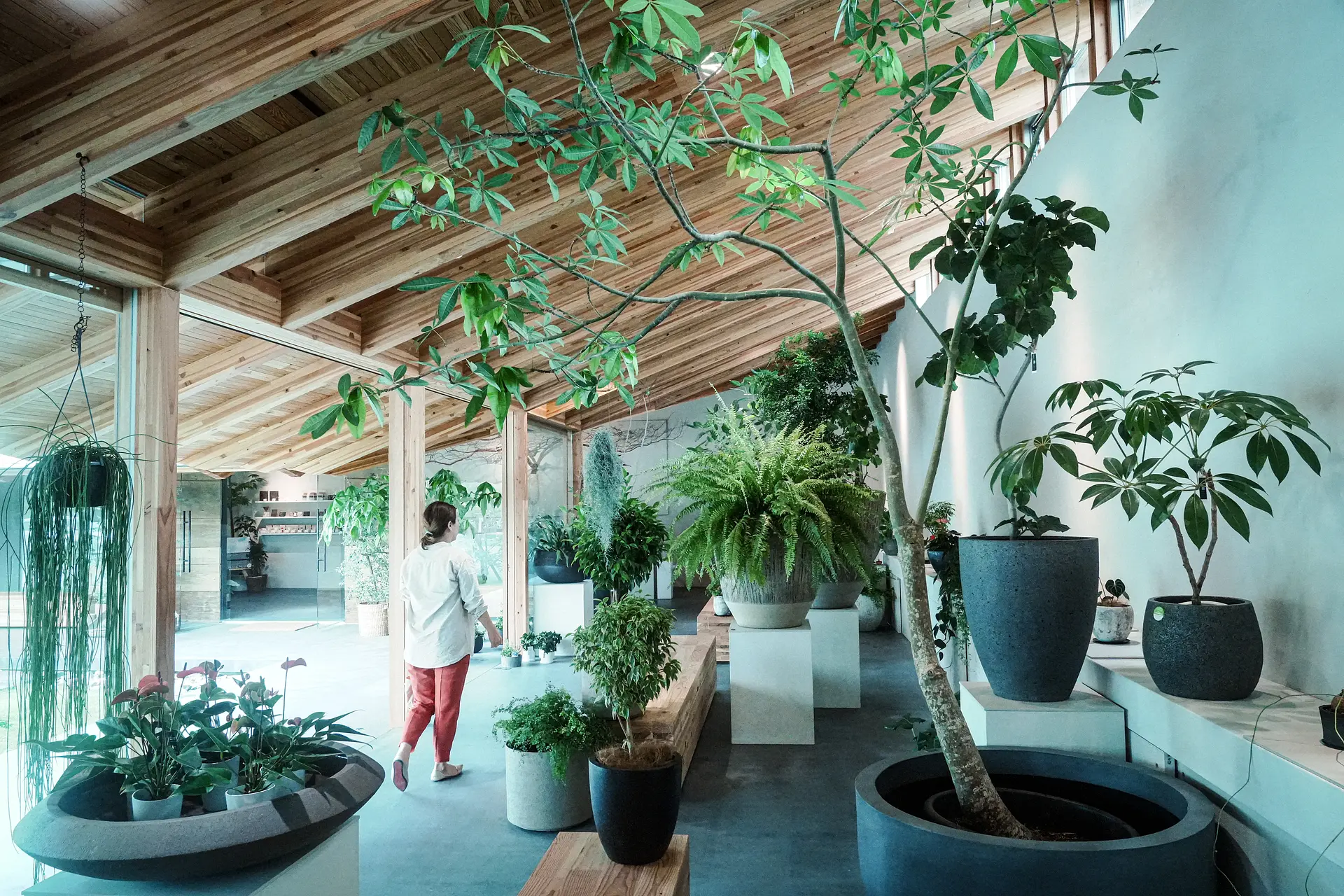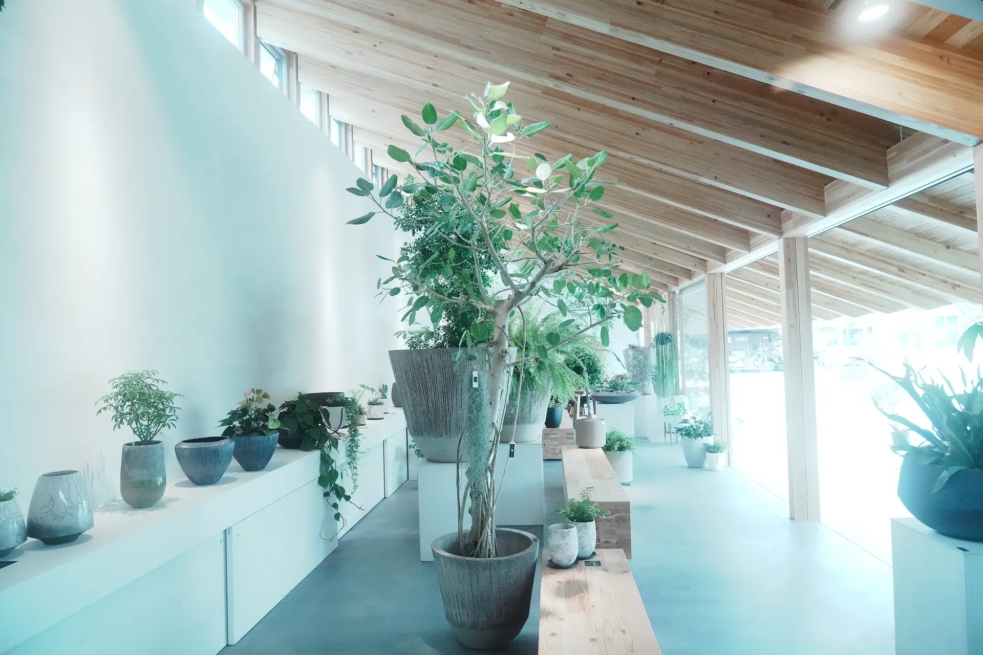 建物は2棟あり西側建物は生花、東側に観葉植物とカフェがあります。