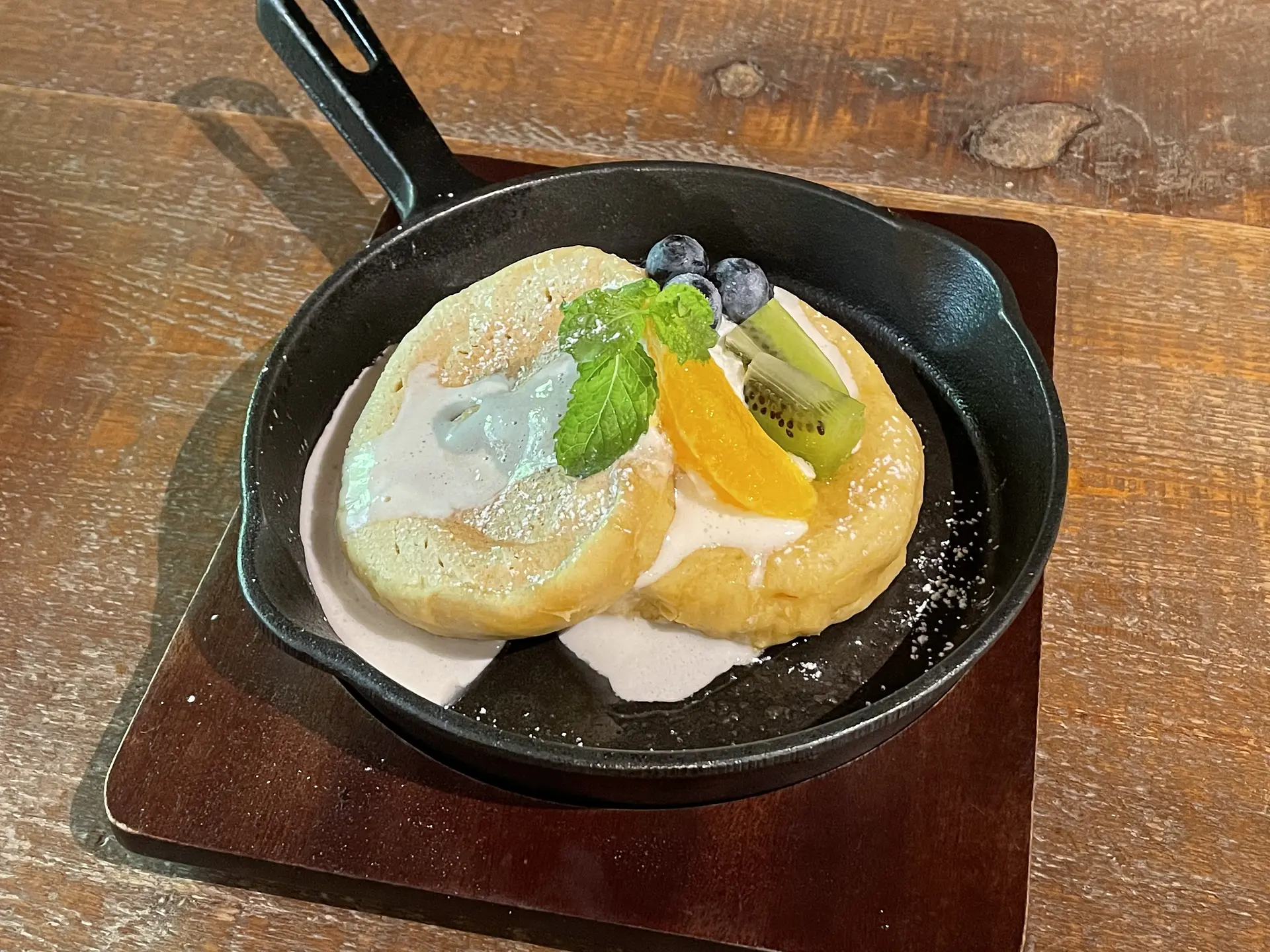 黒蜜ライムという言葉から味が全く想像つかなかったのですが、衝撃的な美味しさでした!黒蜜の濃く甘い味わいをライムでさっぱりといただけ、クラフトコーラのスパイスのような癖になる美味しさで、あっという間に完食いたしました!一緒に頼んだパンケーキも桑名のもち麦と丁寧な作り方のおかげでもっちりと強い弾力があり、こちらも今まで食べたパンケーキとは一味違うとても食べ応えのあるデザートでした!