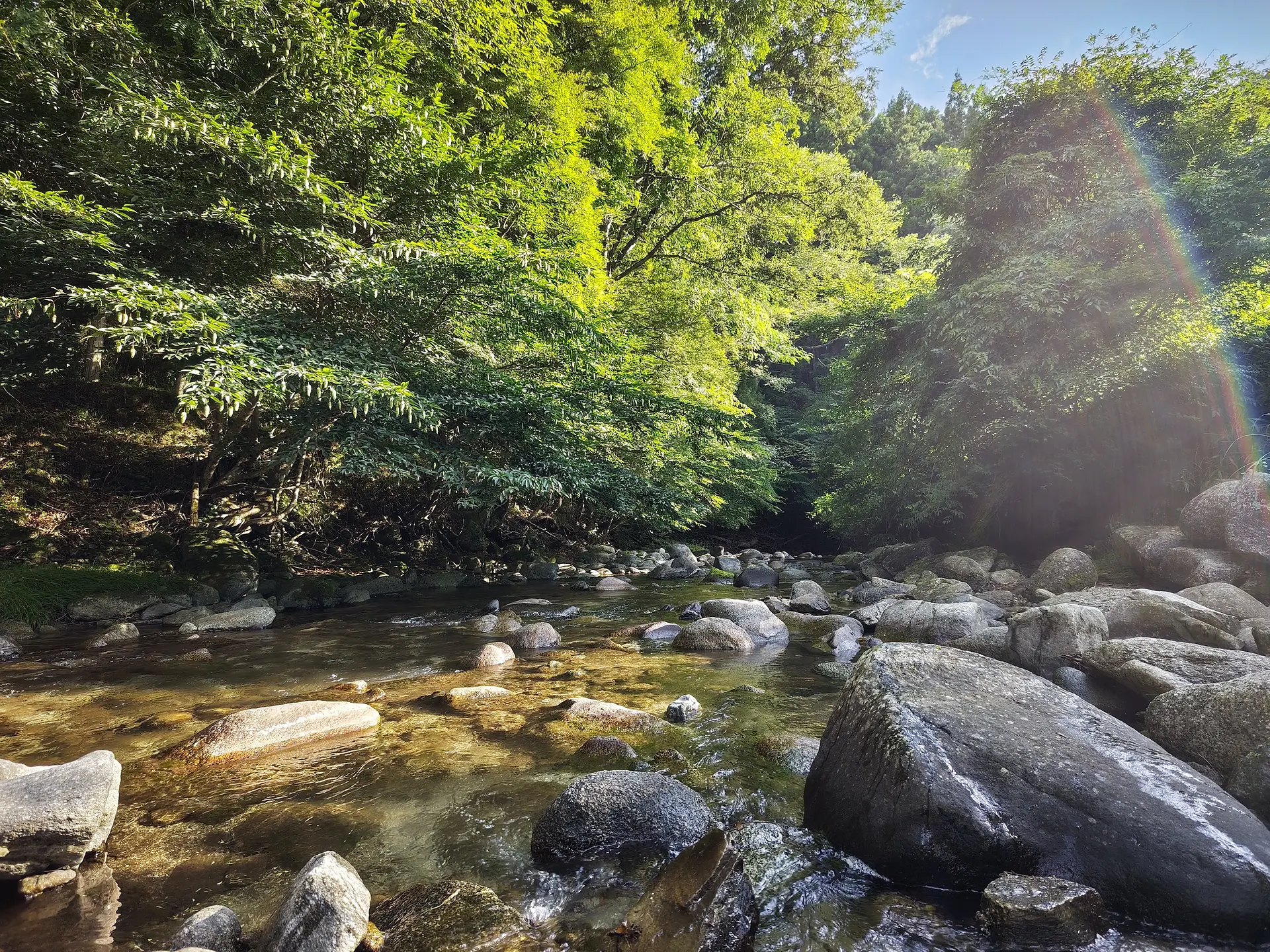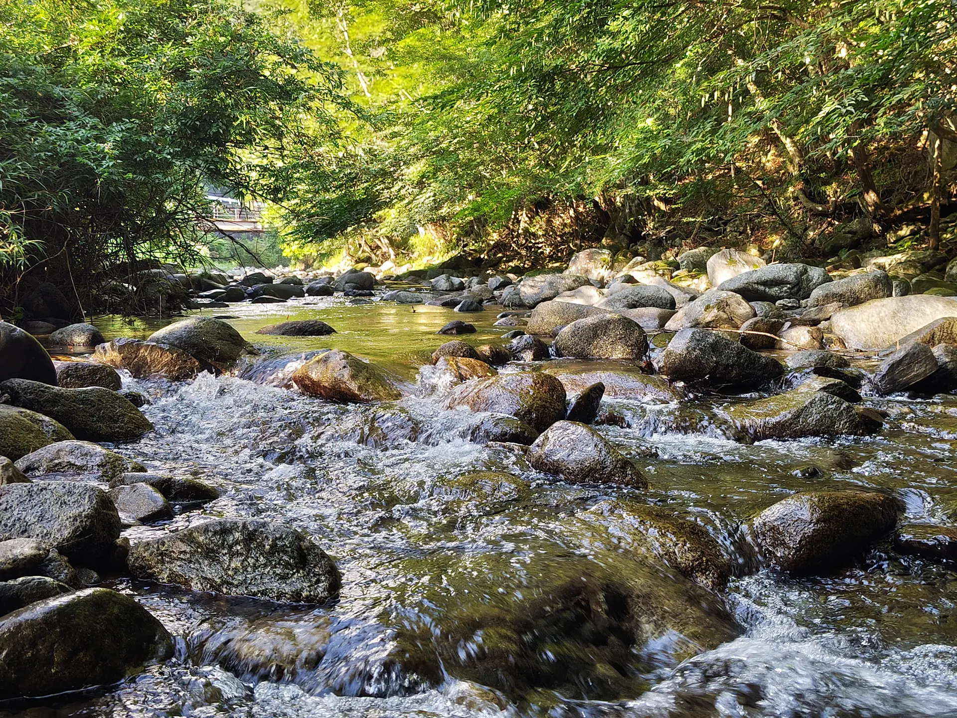 場内にはアマゴも泳いでいるという清流があり、川遊びや生き物探索も楽しめます!小魚がたくさん泳いでいたり、サワガニを見つけることもできましたよ!