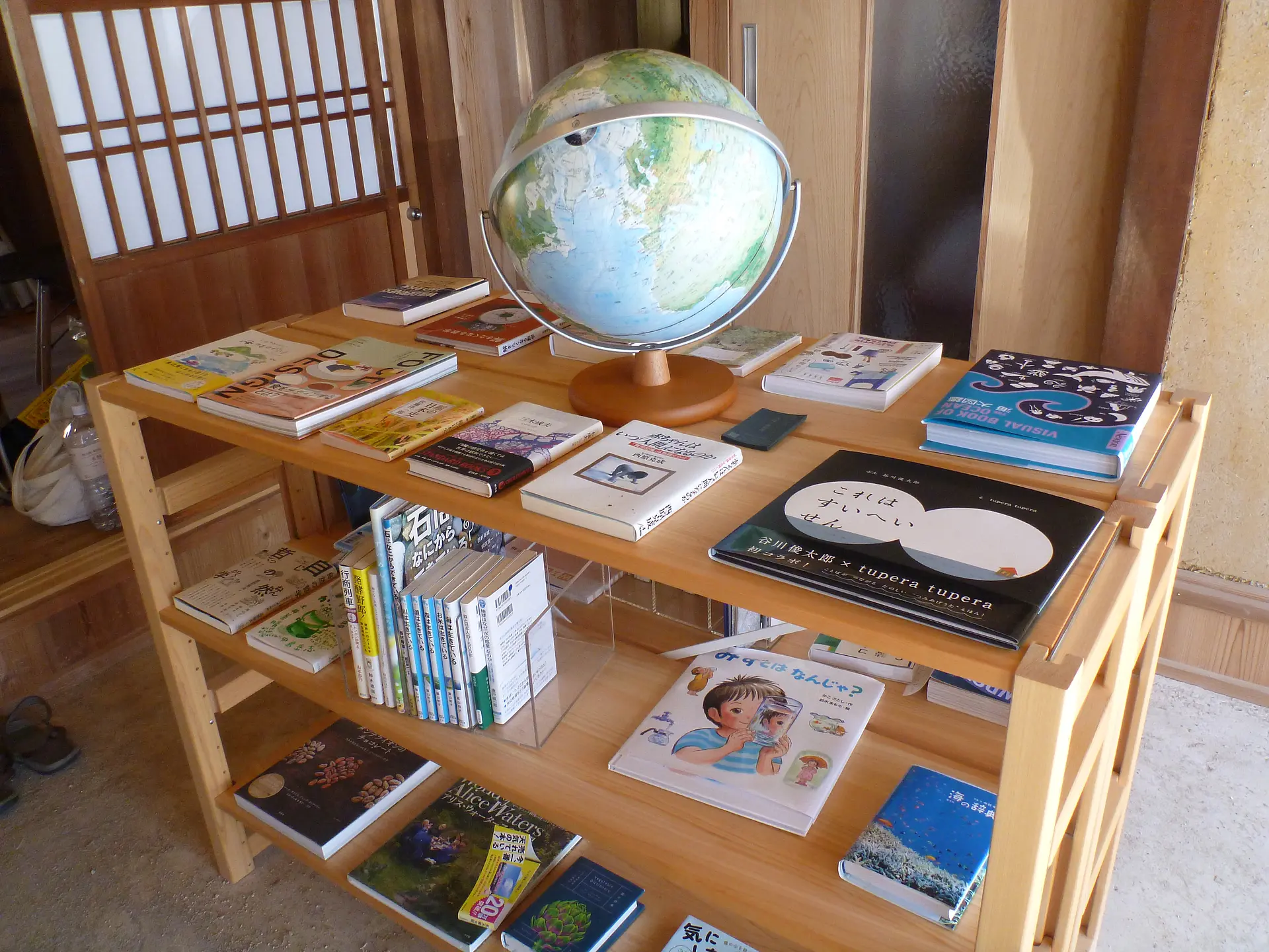 1枚目の写真の棚(地球儀が置いてある方)は自然にまつわる海や食事、環境問題をテーマにした本、