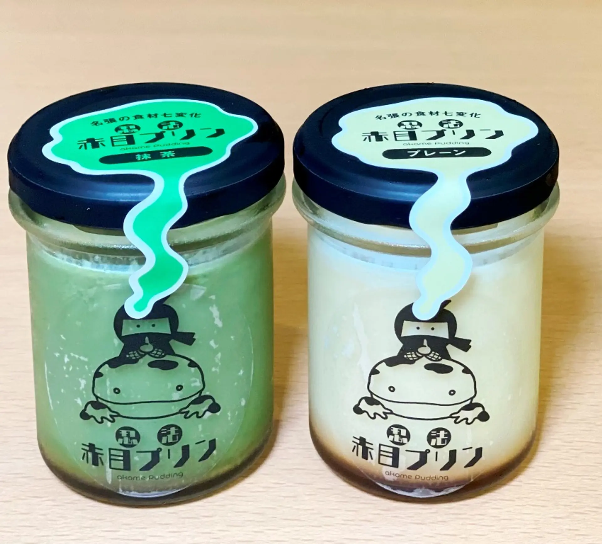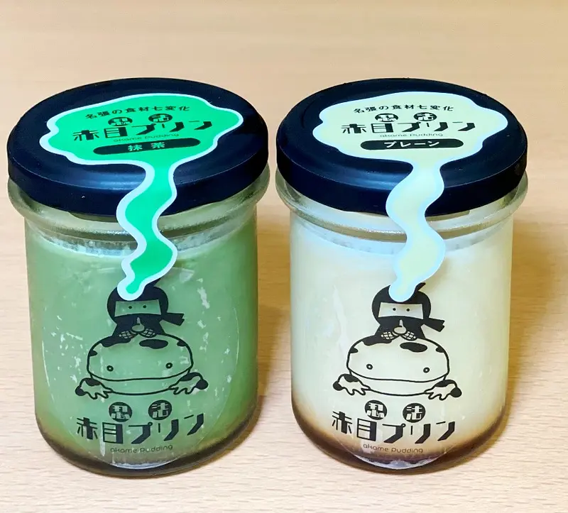 店名は、伊賀忍者ゆかりの観光地「赤目四十八滝」と、看板商品のプリンを組み合わせたユニークなネーミングです。