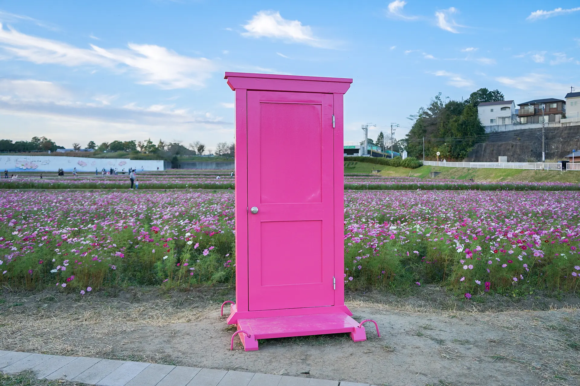 広大なコスモス畑には、どこでも行けそうなピンク色のドアや、地域の方々が作られた顔はめパネル、昨年から好評のカラーベンチを設置していらっしゃいます♪