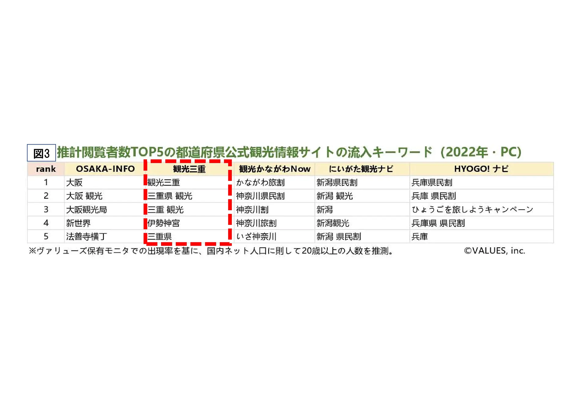 都道府県公式観光情報サイトの推計閲覧者数上位5サイトの流入キーワード(図3参照)を見ると、3位以下は県民割や全国旅行支援に関連するキーワードが目立つなか、「観光三重」においては、「三重県 観光」「三重 観光」といった「都道府県名」と「観光」を組み合わせた複合キーワードや、「伊勢神宮」のように観光スポット名が、サイトへの流入キーワードの上位を占めています。