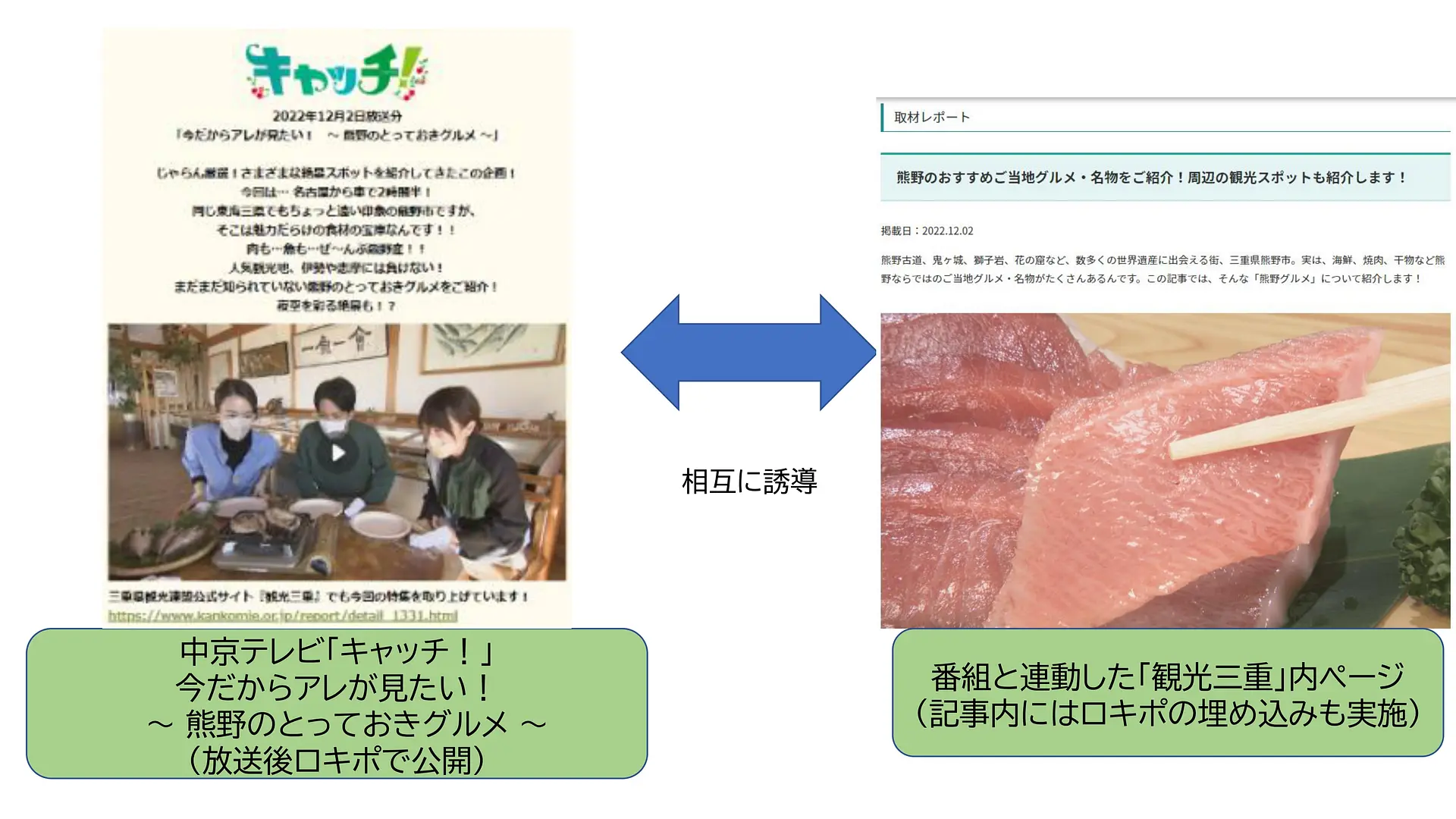 三重県広聴広報課の事業(CBCテレビ)や中京テレビなどのメディアと連携し、番組放送と連動した内容を「観光三重」内のコンテンツとして制作し、ページへの効果的な誘導を実施しました。