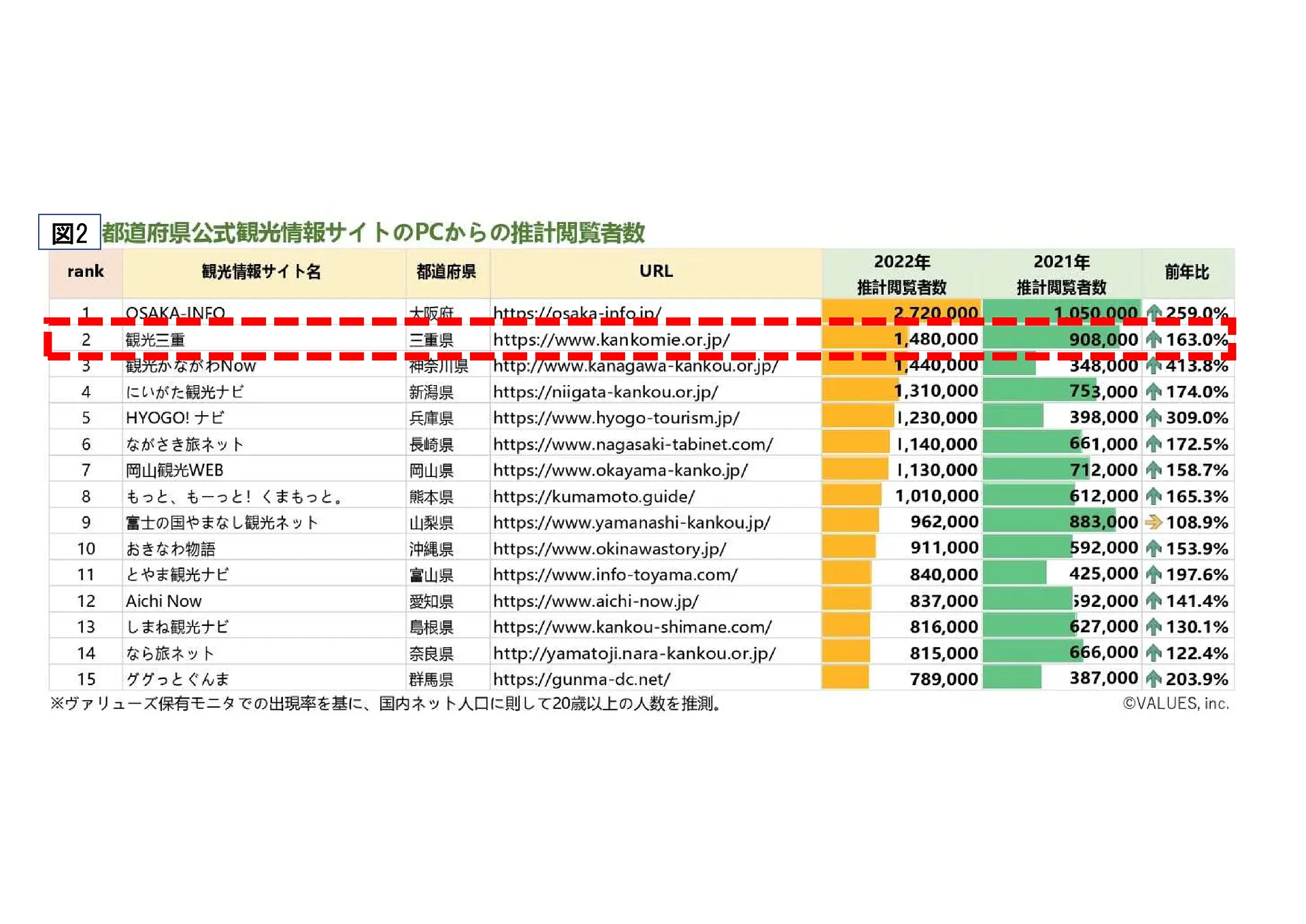 公益社団法人日本観光振興協会と株式会社ヴァリューズが、協同して調査した「2022年観光関連サイト推計閲覧者数ランキング」(令和5年2月14日にリリース)で、公益社団法人三重県観光連盟(会長 竹谷 賢一)の運営する公式サイト「観光三重」が、「都道府県公式観光情報サイト」のスマートフォンからの推計閲覧者数において、全国1位(昨年2位)になりました!!また、パソコン(以下、PC)からの推計閲覧者数、並びにPCおよびスマートフォンからの推計閲覧者数においては、大阪府に次ぐ全国2位(それぞれ昨年2位)となりました!