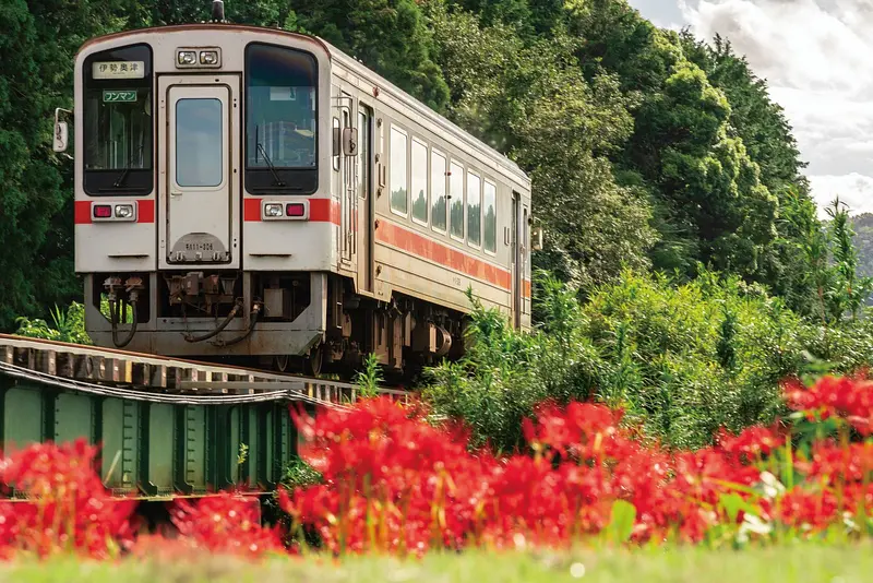 秋になると、名松線一志駅〜井関駅の区間の線路沿いに彼岸花が咲き誇ります。名松線と真っ赤な彼岸花の風景をお楽しみいただけます。