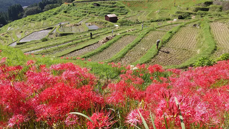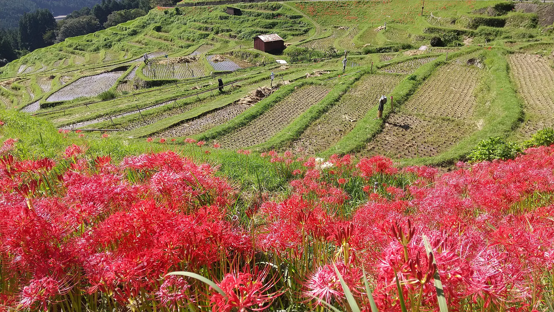 紀和町丸山地区の斜面に幾重にも広がり、日本の棚田百選にも選ばれている丸山千枚田。稲刈りが終わり秋を迎えると、畦道に彼岸花がお目見えします。棚田と赤い彼岸花が、ほかにはない景色を作り出します。