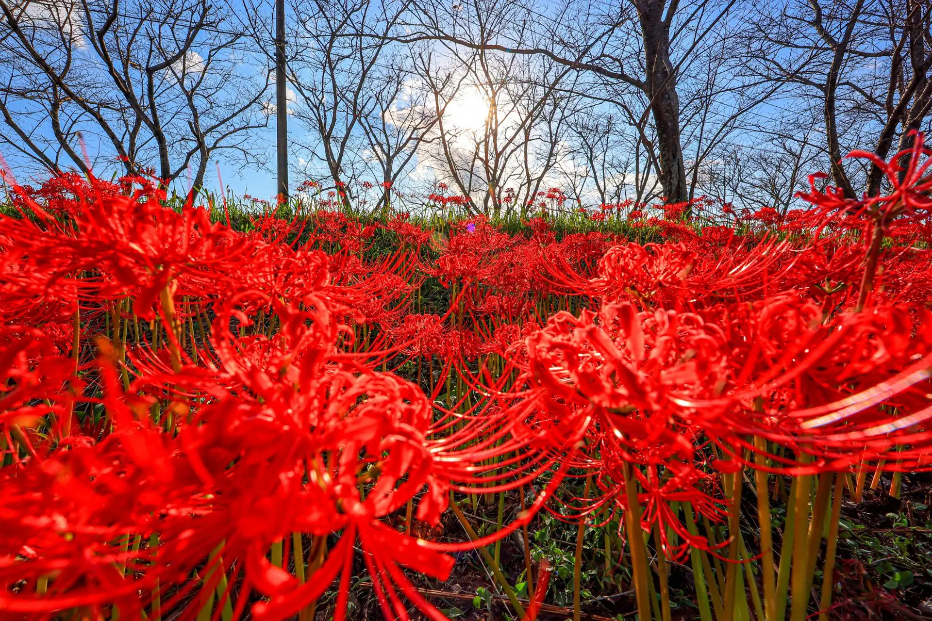 桜の木を覆うように咲く箇所や、斜面に咲くところもあり、ボリュームのある彼岸花を楽しむことができます。