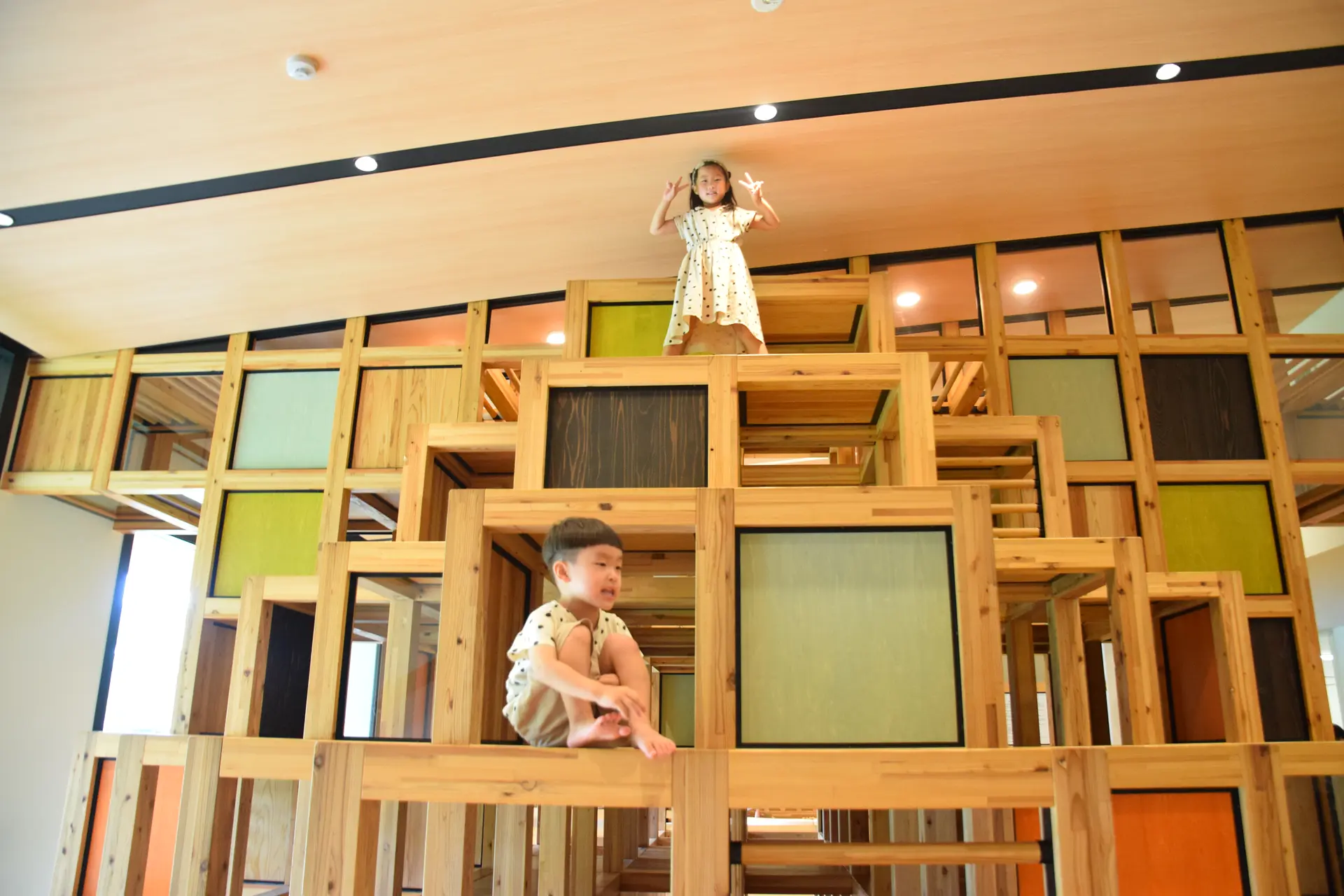木の香りがあふれ、温かみのあるプレイグランドのキノパークは、木の知育玩具や、ジャングルジム「モッキンガム」などがあり、子供達に大人気♪靴を脱いで遊ぶのでハイハイやよちよち歩きの子供も思う存分に遊ぶことができます。