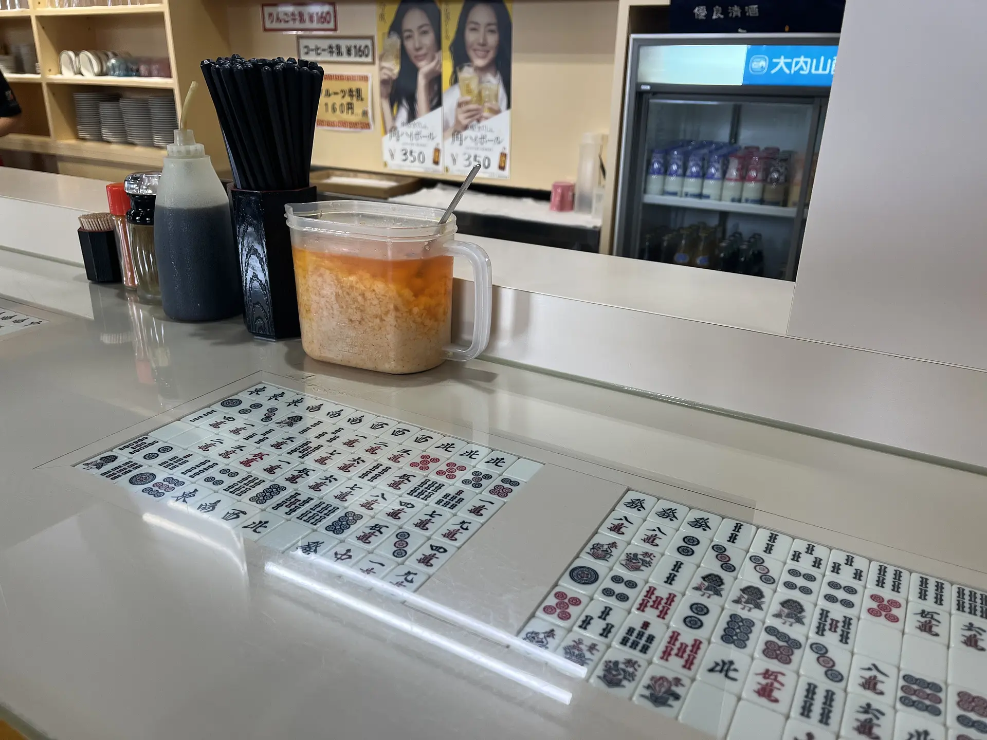 カウンター席には麻雀牌が埋め込まれており、ひとつ揃うとあがりになるテンパイの状態に。