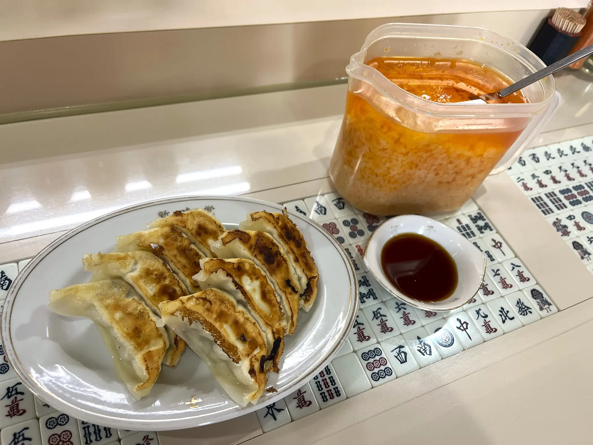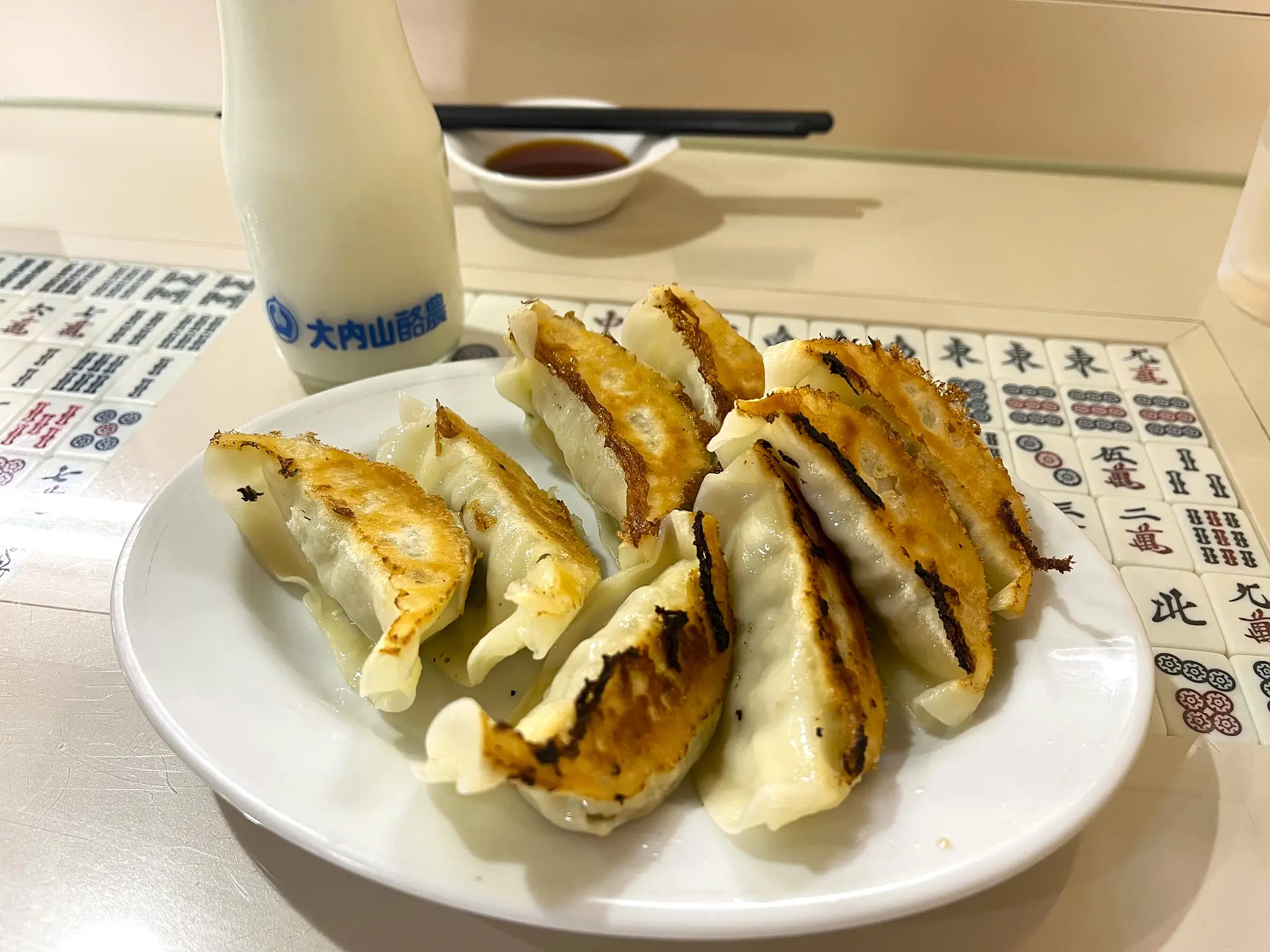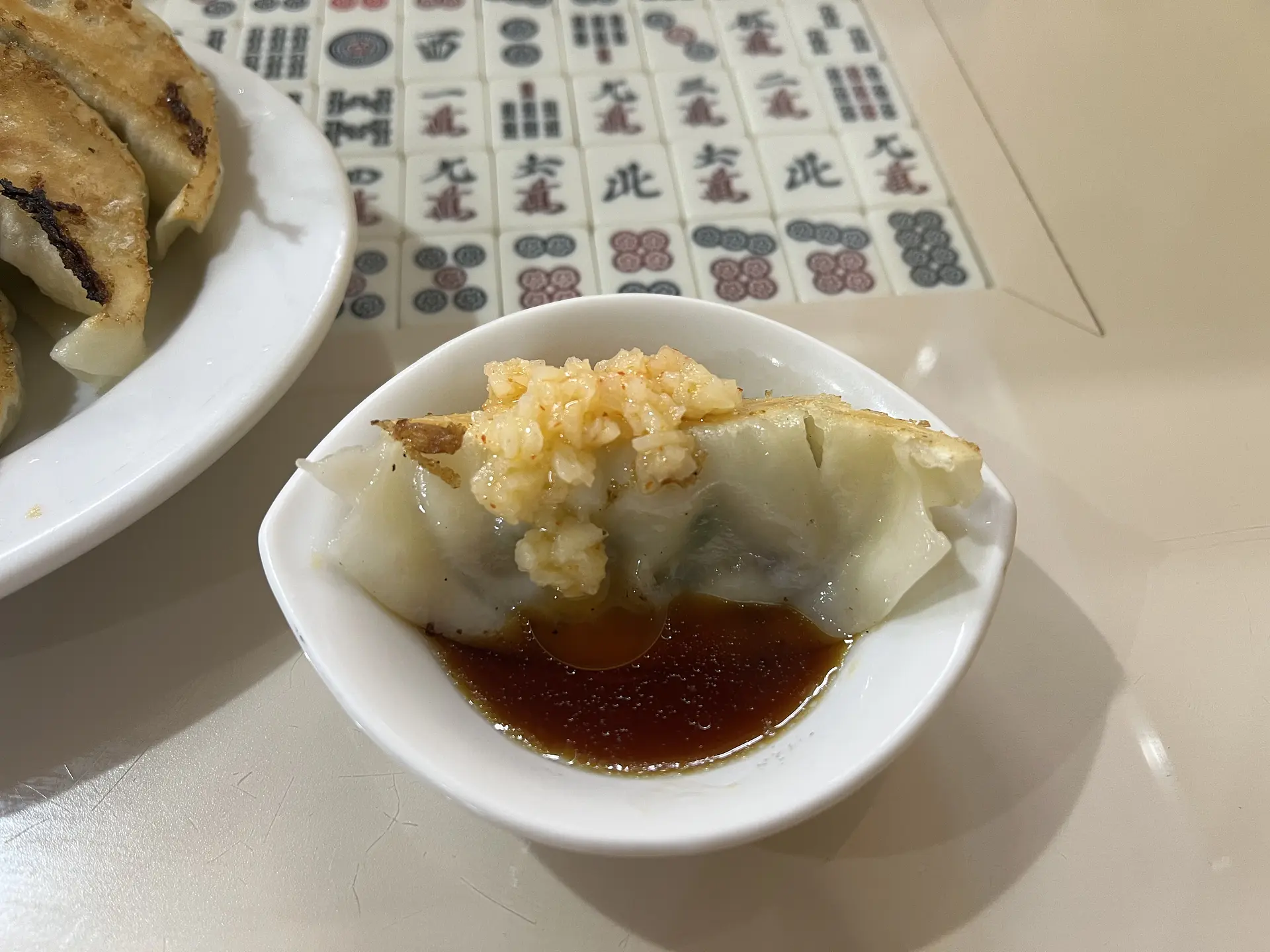 麻雀牌を眺めて待っていると、できたての餃子が出てきました。表面はパリッと、食べるともちもちした食感がたまりません。
