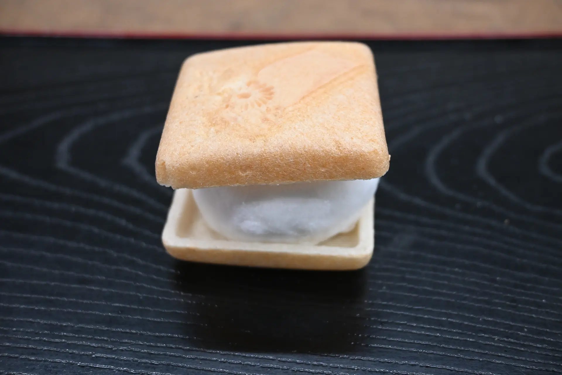 岩嶋屋さんの人気商品の「大福最中」。生クリームを粒あんで包んだ大福を最中で挟みます。秋は生クリームを栗きんとんで包みます。栗きんとんと生クリームの相性抜群で、別包装のさくさくの最中と一緒にいただくと、生クリーム、栗、餅、最中のそれぞれの食感が楽しめます。