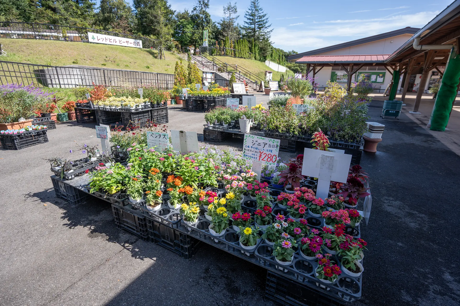 レッドヒルヒーサーの森 入口の階段付近では、ローズガーデンの開園に合わせてお花の販売があります♪