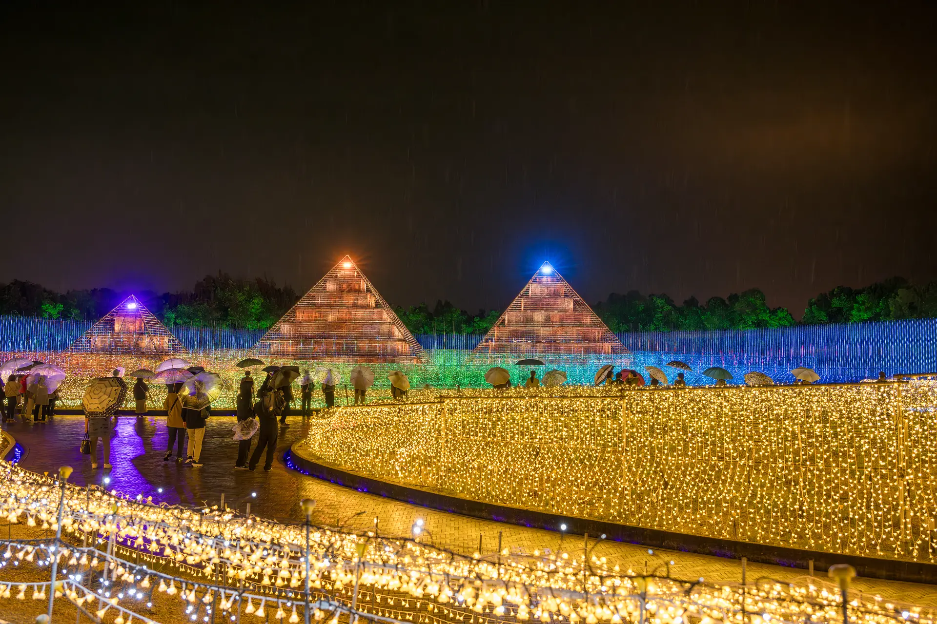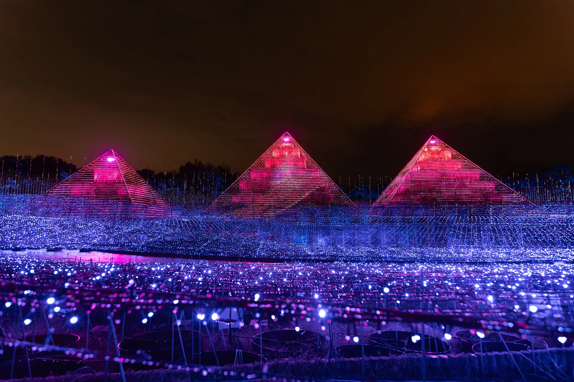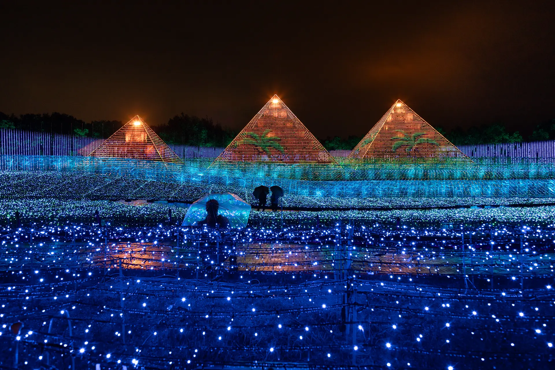 2004年から開催し、今年で20回目の節目を迎えた「なばなの里イルミネーション」。2023-2024のテーマは「黄金のピラミッド」。世界遺産にも登録されているエジプトのピラミッドを舞台に、黄金のピラミッド・ナイルの繁栄・エジプト神話の3つのストーリーを光と音でダイナミックに演出します!