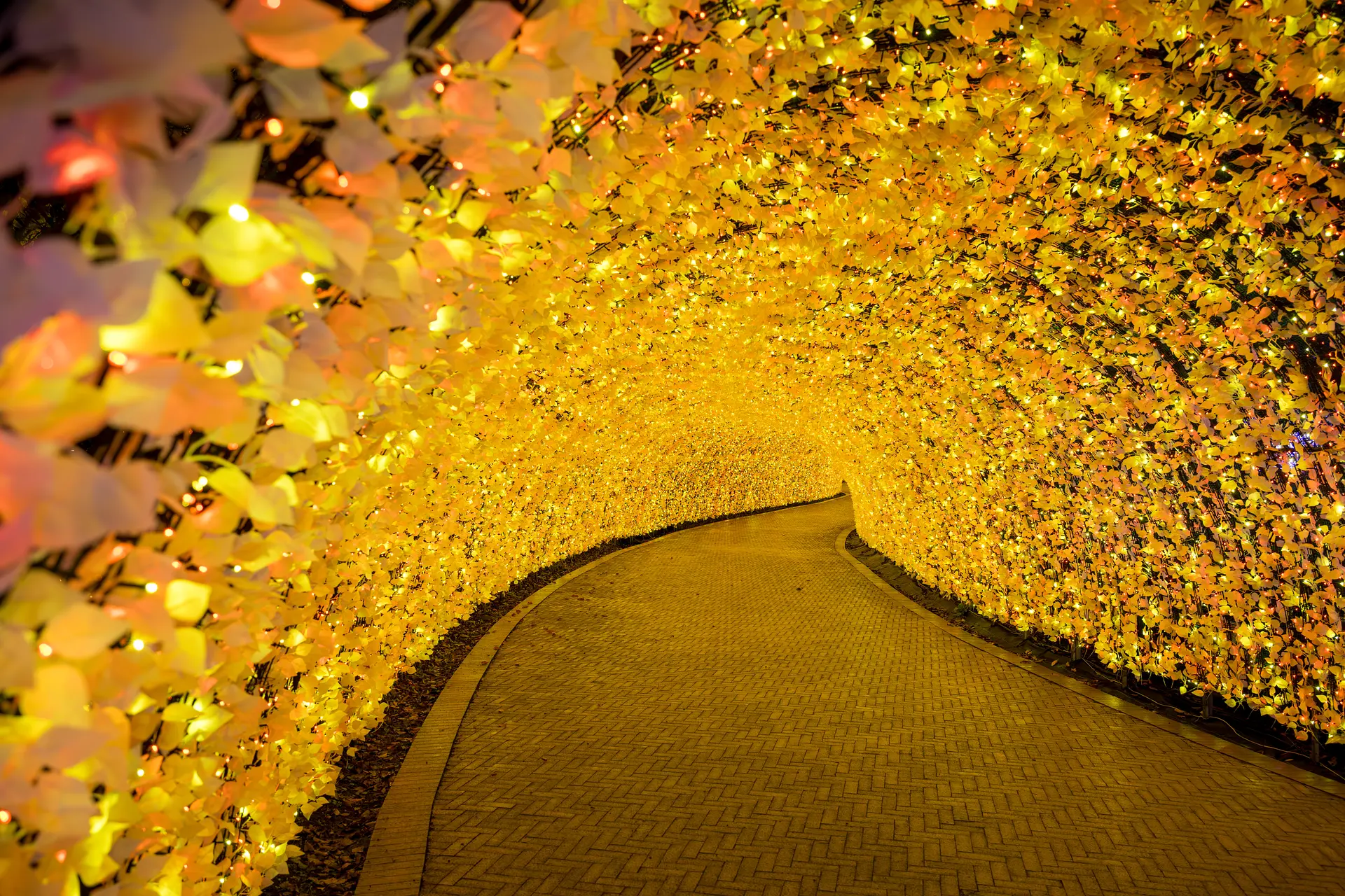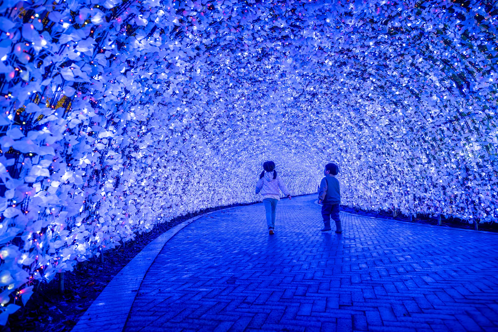 園内にある「光のトンネル」の2つ目「花と華」は、春に爽やかな青色で一面を染めるネモフィラと、夏から秋を彩る華やかなオレンジ色が可愛らしいマリーゴールドの季節をつなぐ花のリレーを青・ライトブルー・オレンジ・黄色のLEDのあかりで演出します。