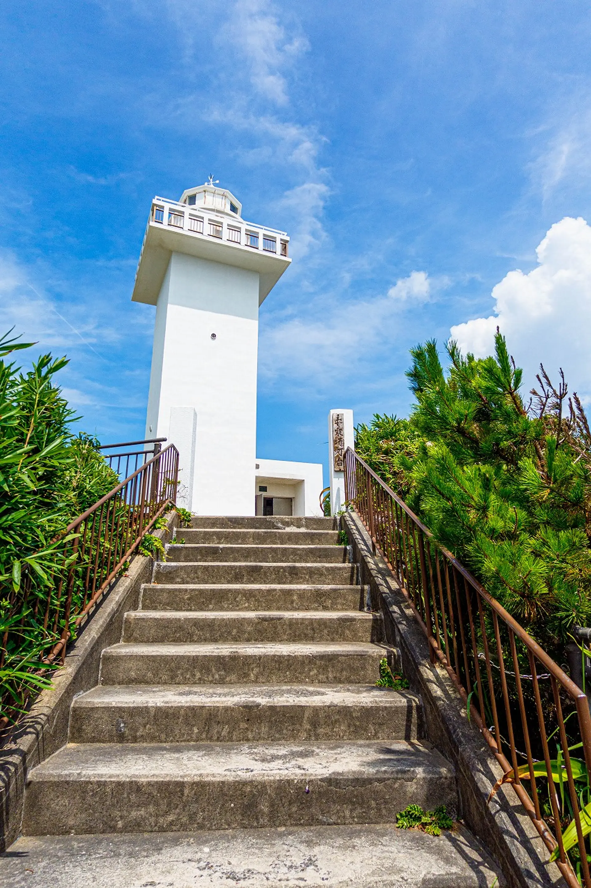 全国的に珍しい四角形の白い灯台で、日本に16か所しかない実際に「登れる灯台」の一つなんです。周辺には灯台資料館や芝生の広場やカフェもあり更に観光気分を味わえますよ。