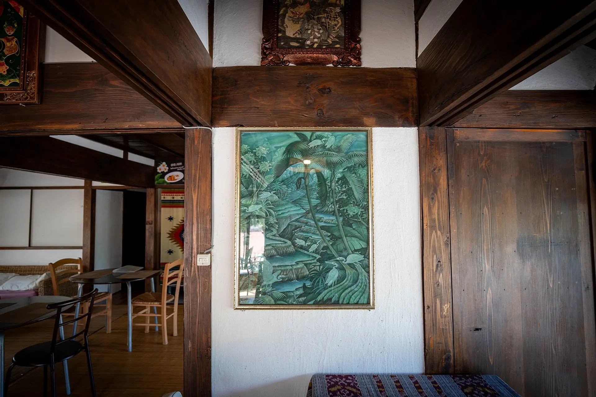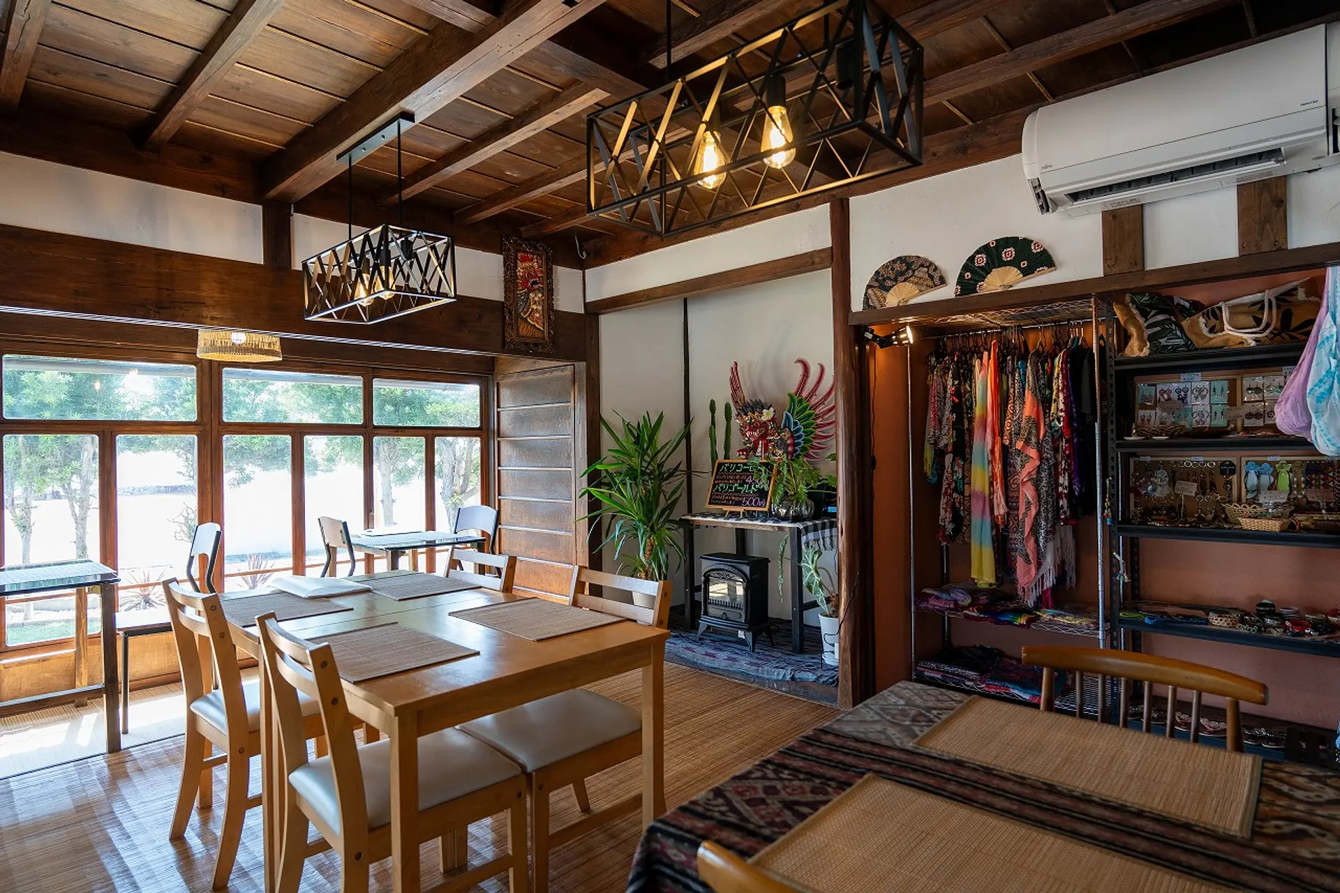 お店の外観はこんな雰囲気でひと目見ただけで期待が膨らみます。中へ入るとインドネシアの異国感たっぷりでエスニックな雰囲気と、いにしえの時を重ねた古民家の重厚感が混ざり合ってお洒落な空間になっています。1フロアーで広々とした店内は玄関で靴を脱いで上がるスタイルなのでお店の中でとても寛げます。こんな感じの素敵なお店なのですが、実は目的来店じゃないと見つけることがほぼ不可能な隠れ家的な立地にあるお店なんです。近くまで行けばお店の隣は国府神社があって分かり易いのでぜひ足を運んでみてもらいたいです。