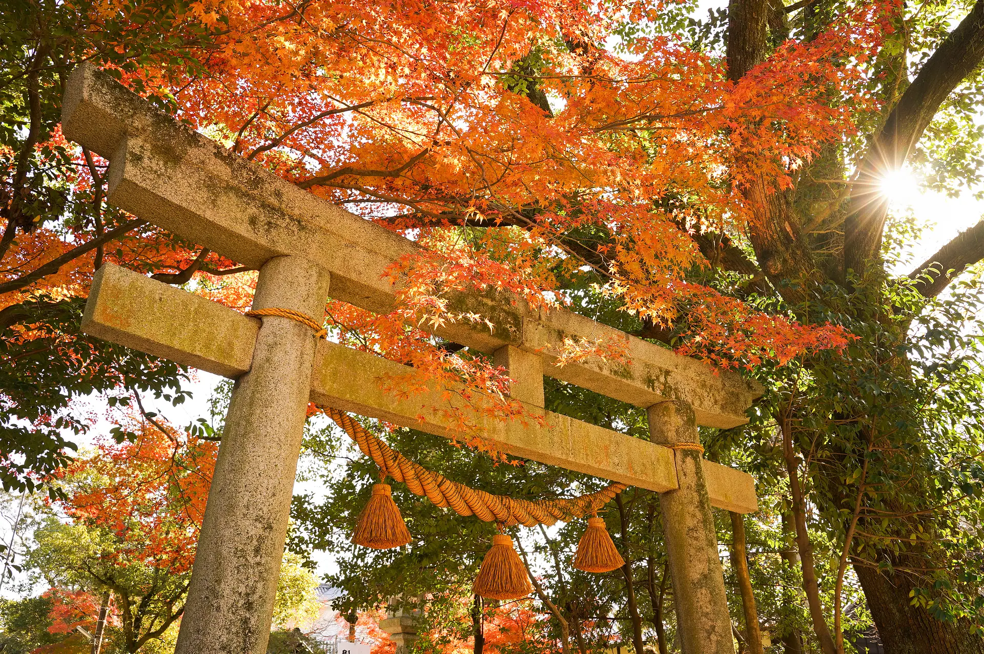 静かに佇む鳥居に降り注ぐ紅葉は、光にあたると美しく輝きます!また、鳥居をくぐって右側の方も 紅葉が深まると赤く染まります◎