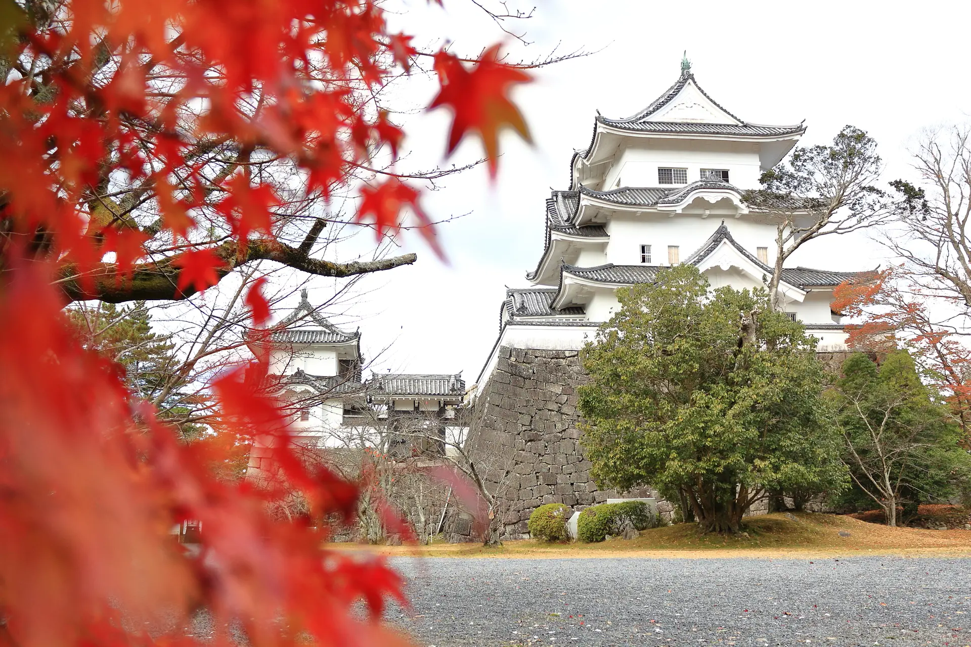 お城がある本丸広場には、少し離れたところですがモミジがあり、紅葉越しに天守閣を見るとモミジの赤と天守閣の白とのコントラストが素敵で、筆者は気に入っています。