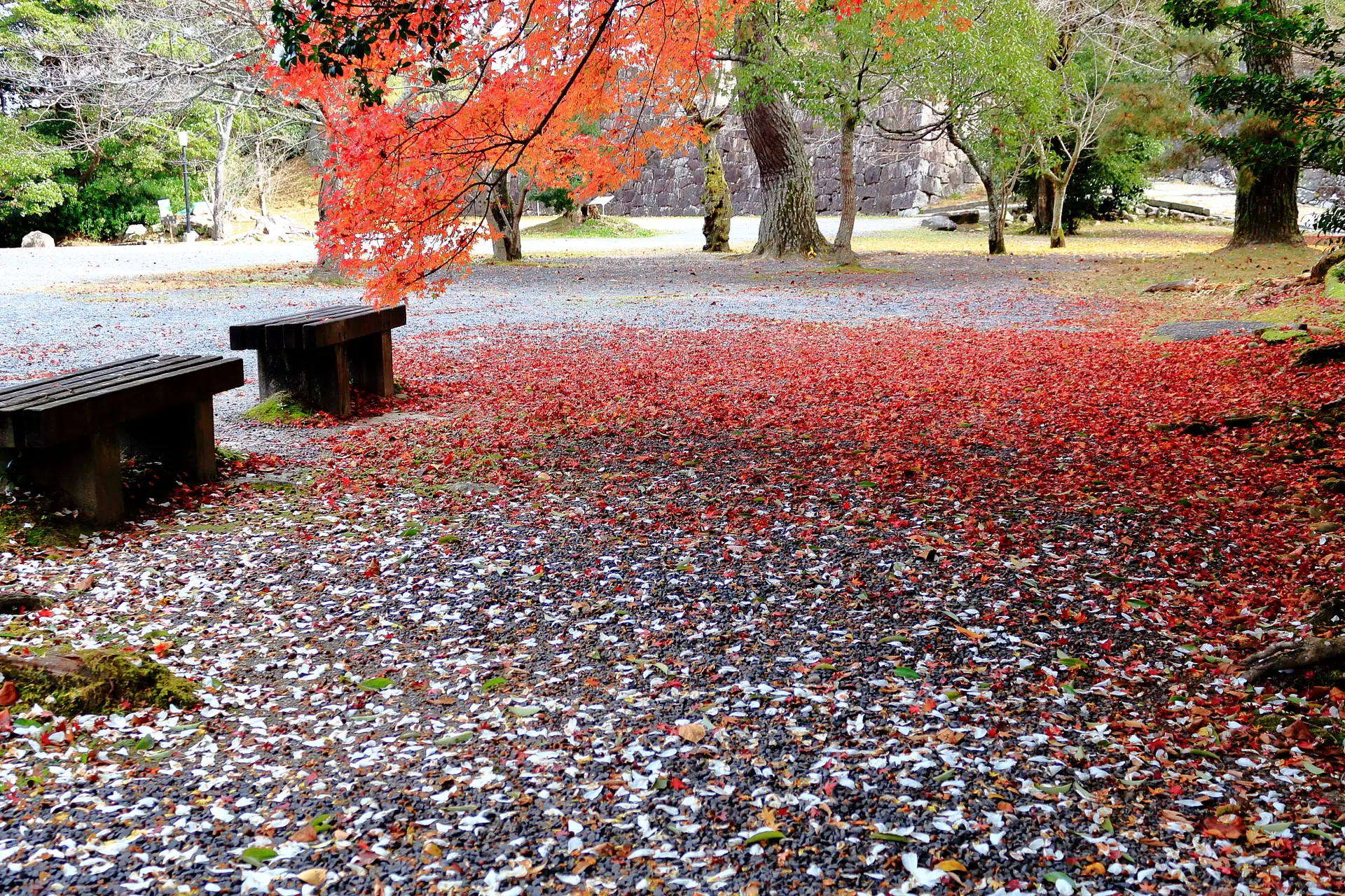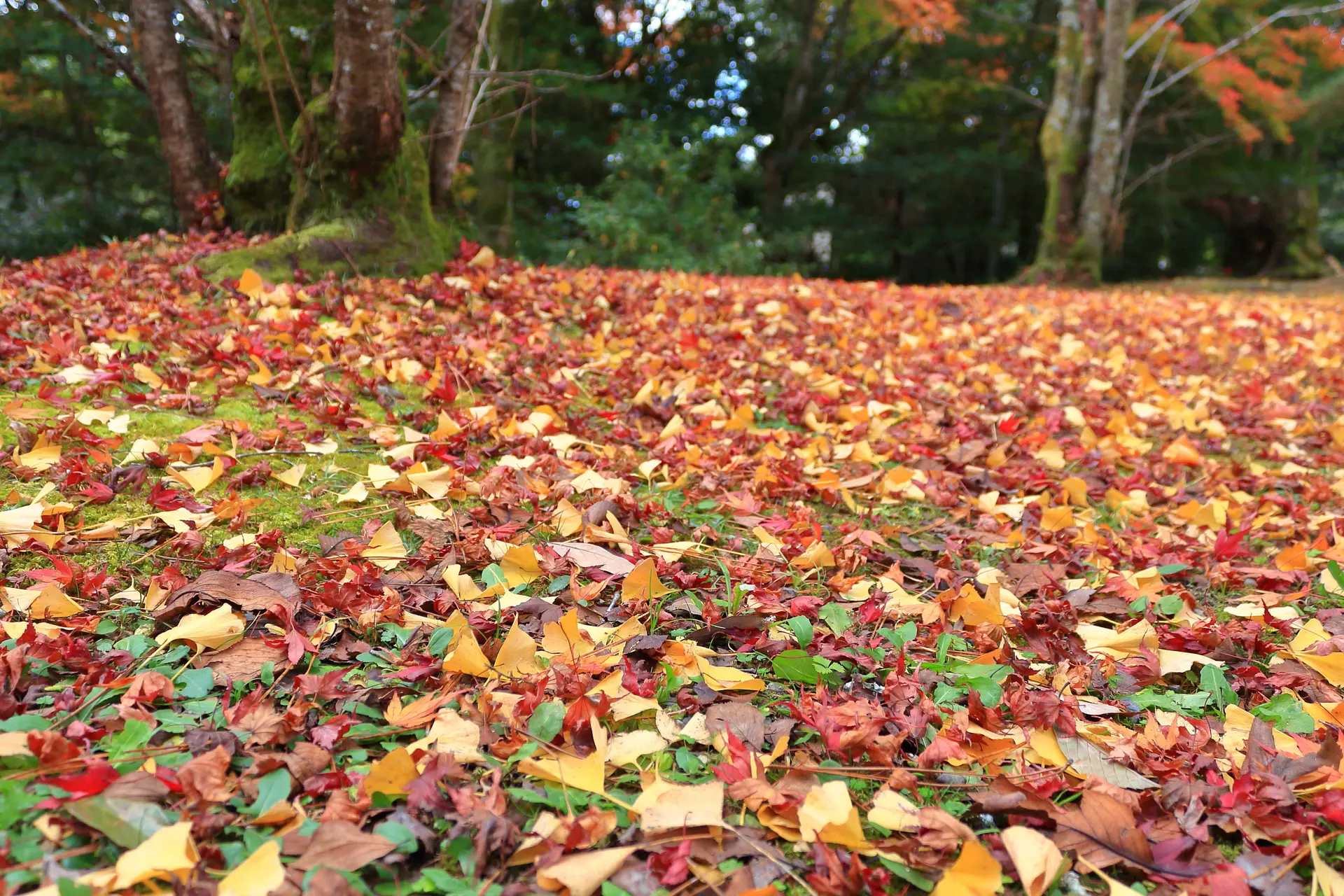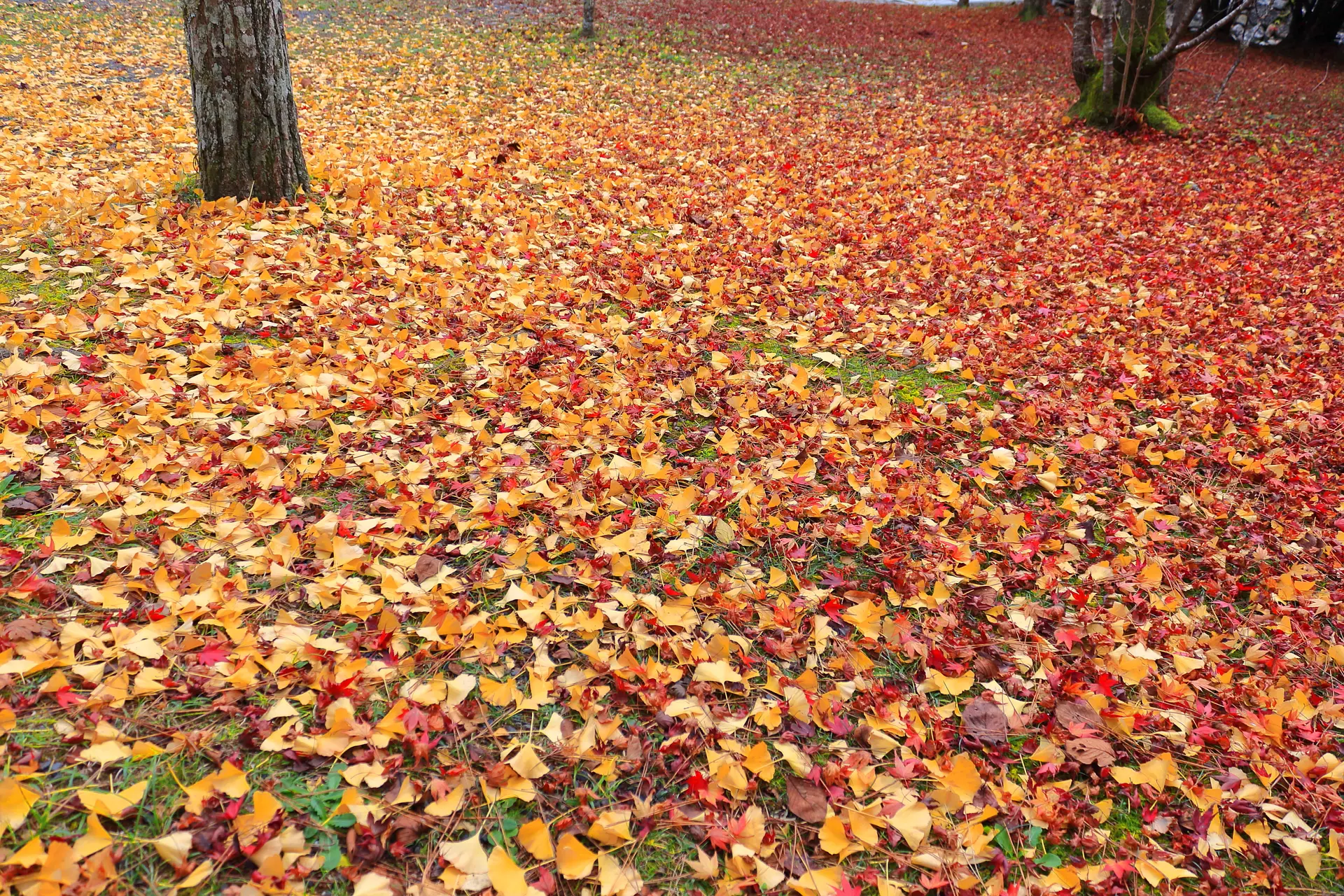 こちら⇧は、紅葉とイチョウの落葉のコラボレーション。草や苔などの緑色もあると、赤・黄・緑の三色になります。
